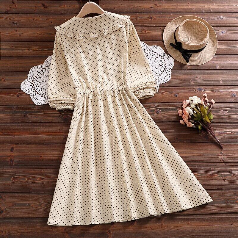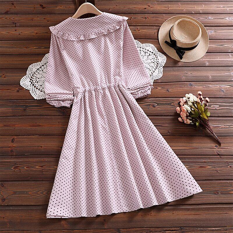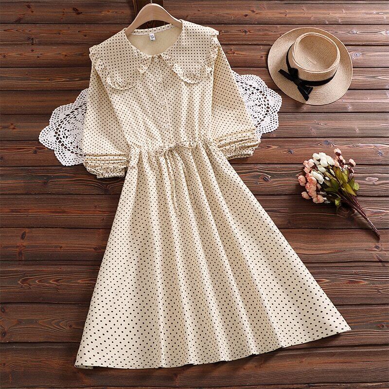 送料無料୨♥୧ スタイルオータムスプリングレディースドレス カラー水玉レース長袖スリーブドレス ワンピース ロング ピンク 大人ガーリー スウィート キュート カジュアル 春物 秋物 レースアップ AOS697302001