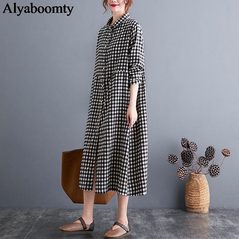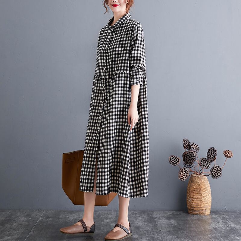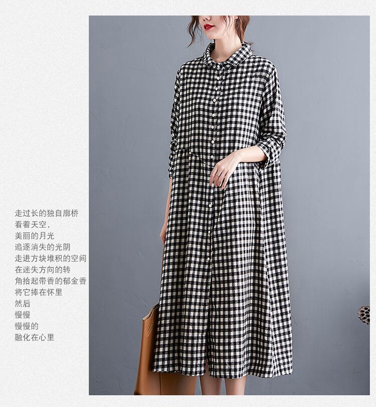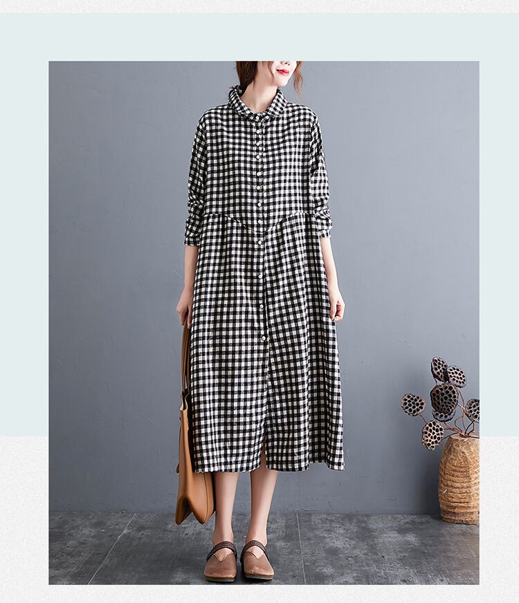 送料無料୨♥୧ オータムスプリングレディースシャツ ドレス カラーブラックブラウン格子柄ヴィンテージルーズロング コットン 春物 秋物 ビンテージ AOS19036728924