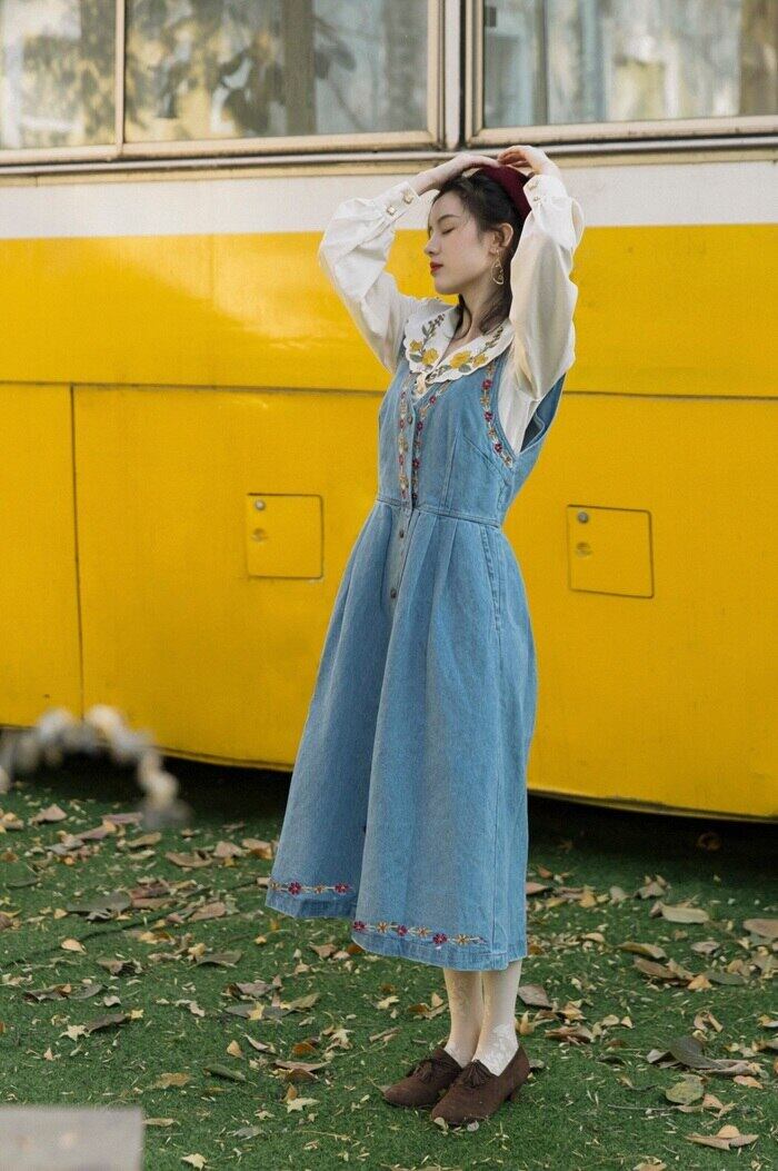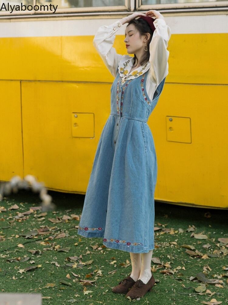 送料無料୨♥୧ スタイルスプリングオータムレディースセット 刺繍ロングヴィンテージ ブルー ブラウス 春物 秋物 ビンテージ ヨーロピアン AOS9653786155