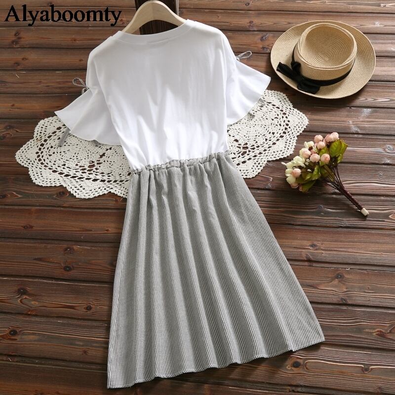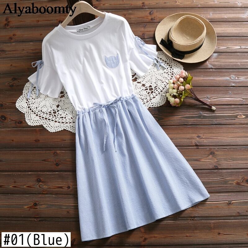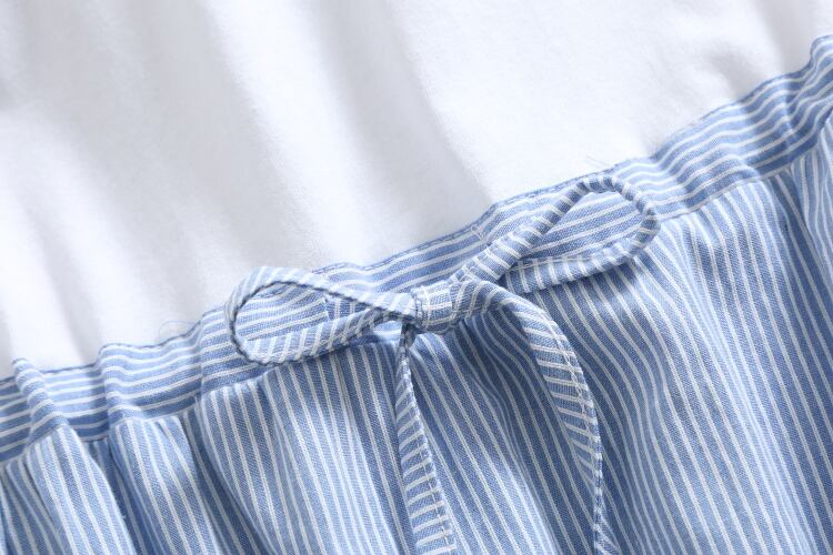 送料無料୨♥୧ スタイルサマーレディースAラインドレス ストライプレース半袖スリーブブルーグレー ショート コットン ハーフスリーブ 大人ガーリー スウィート キュート カジュアル 夏物 Oネック レースアップ AOS25368208127
