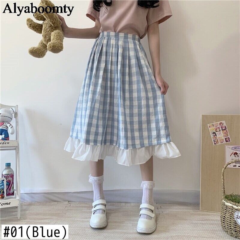 送料無料୨♥୧ サマーレディーススカート ウェストブルー格子柄フリルスタイル ラッフル 大人ガーリー スウィート キュート カジュアル 夏物 AOS7489480781