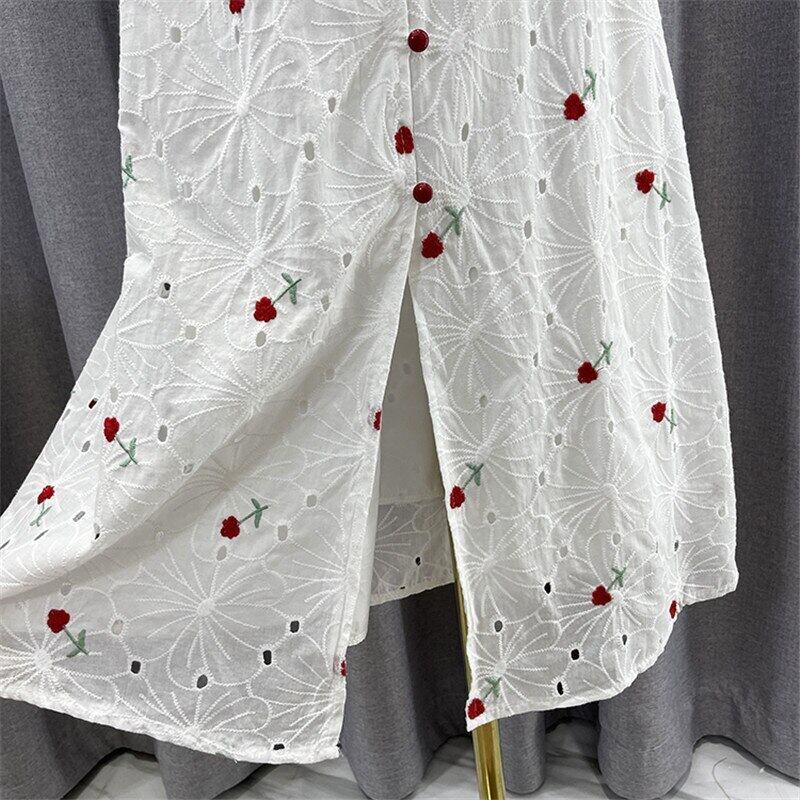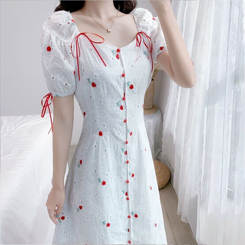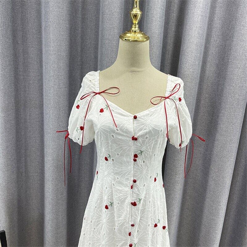 送料無料୨♥୧ サマーレディースホワイトドレス カラーフローラル刺繍リボンロング コットン 夏物 花柄 スクウェア AOS11914602282