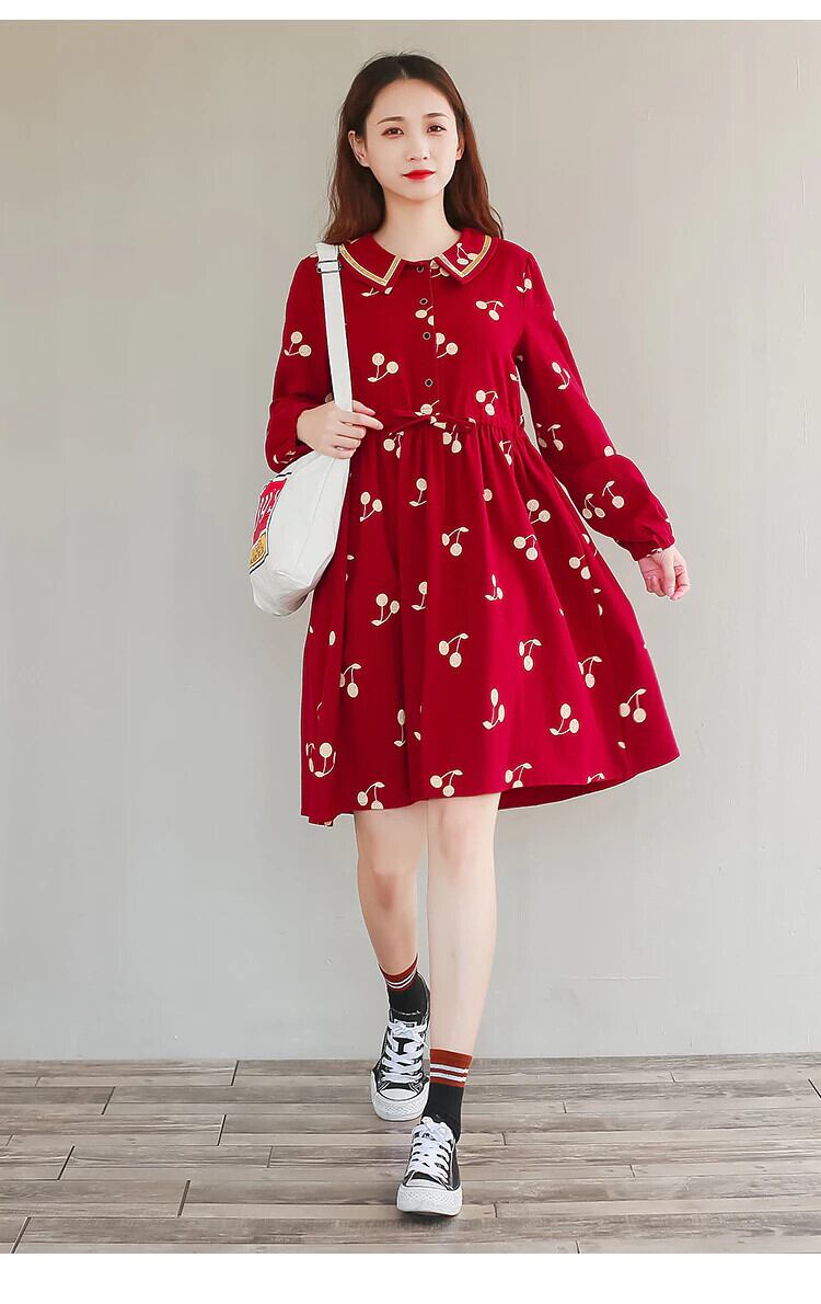 送料無料୨♥୧ オータムスプリングレディースドレス カラープリントレッドダークグレー長袖スリーブ ロング 大人ガーリー スウィート キュート カジュアル 春物 秋物 AOS5859345024