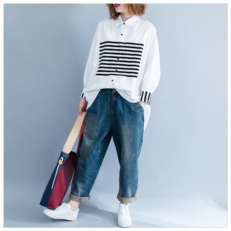 送料無料୨♥୧ スプリングオータムレディースブラウス ストライププリント柄パッチワークルーズホワイトトップス シャツ コットン 春物 秋物 AOS4943235878