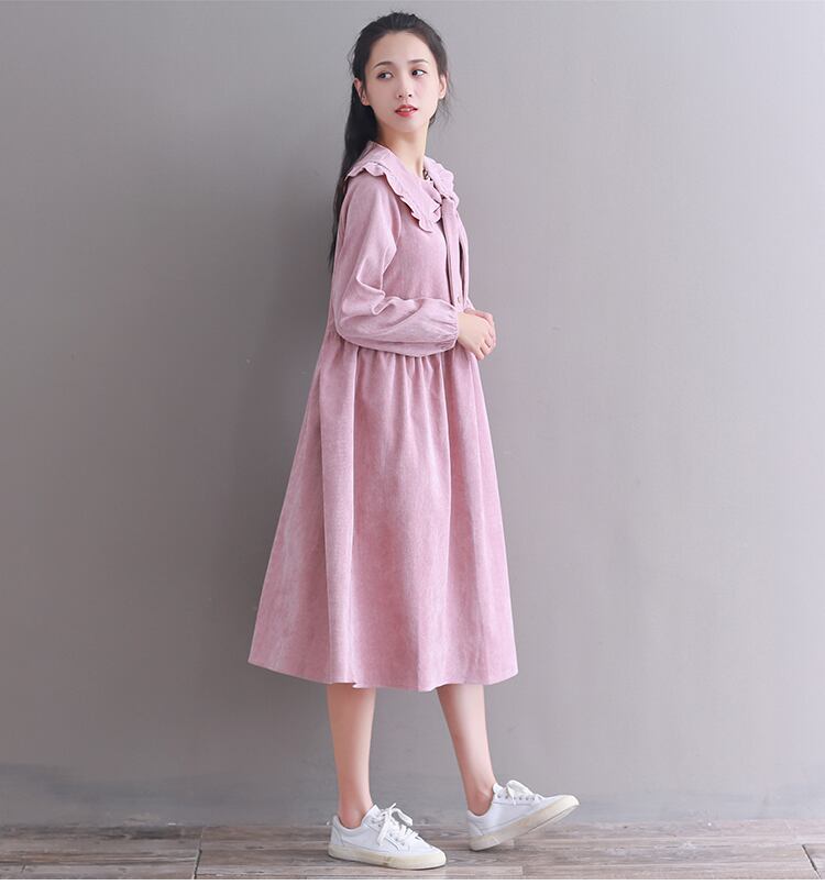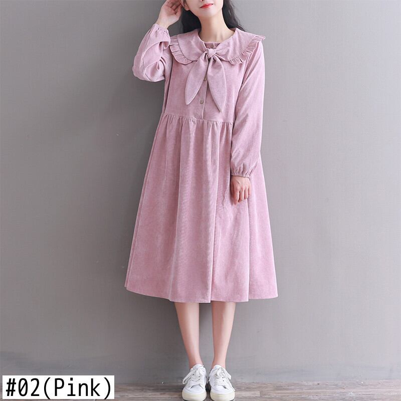 送料無料୨♥୧ オータムウィンターレディースドレス カラーロングコーデュロイヴィンテージリボン 大人ガーリー スウィート キュート カジュアル 秋物 冬物 ビンテージ AOS93446463319