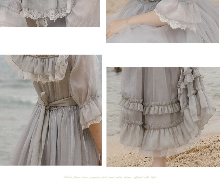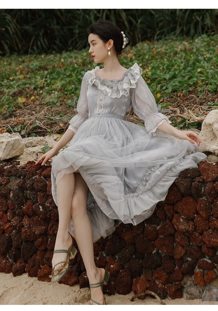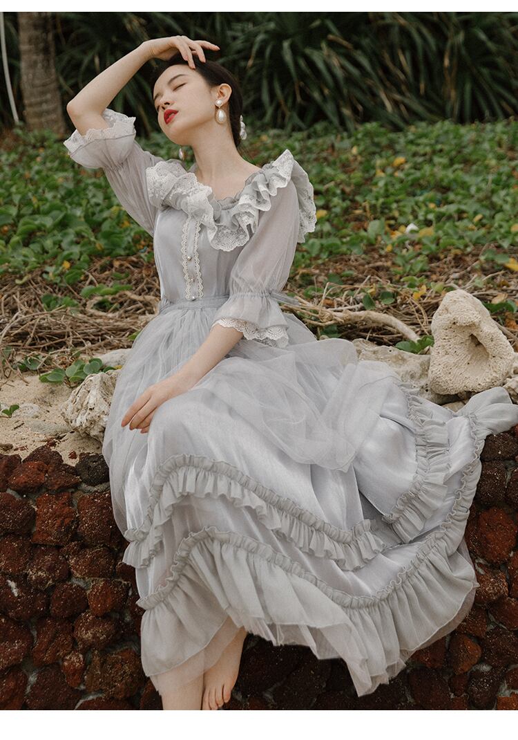 送料無料୨♥୧ サマーレディースロングドレス スタイルレースフリルメッシュ レッド ラッフル 夏物 シルバー 銀 AOS86107614887