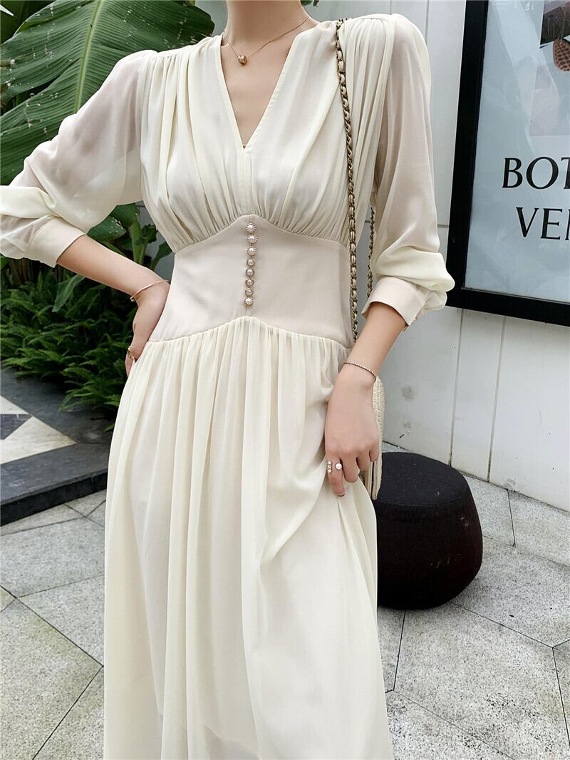 送料無料୨♥୧ スプリングオータムレディースマキシドレス Vネックブラックシフォンミディ ロング 春物 秋物 AOS50097544184