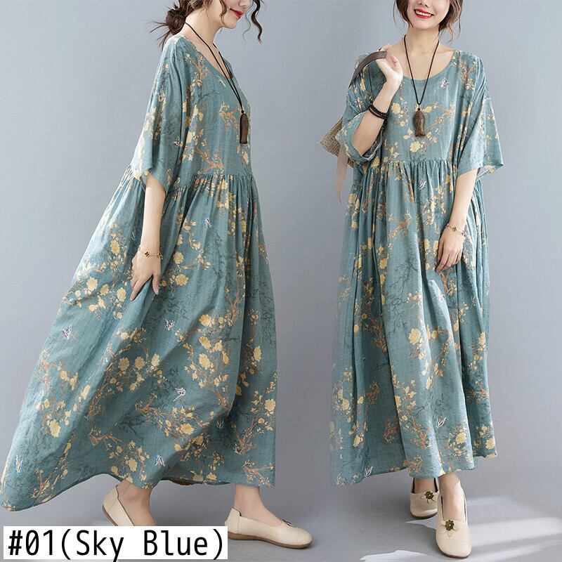 送料無料୨♥୧ サマーレディースマキシロングドレス フローラルプリントガウン 夏物 花柄 Oネック AOS96174587428