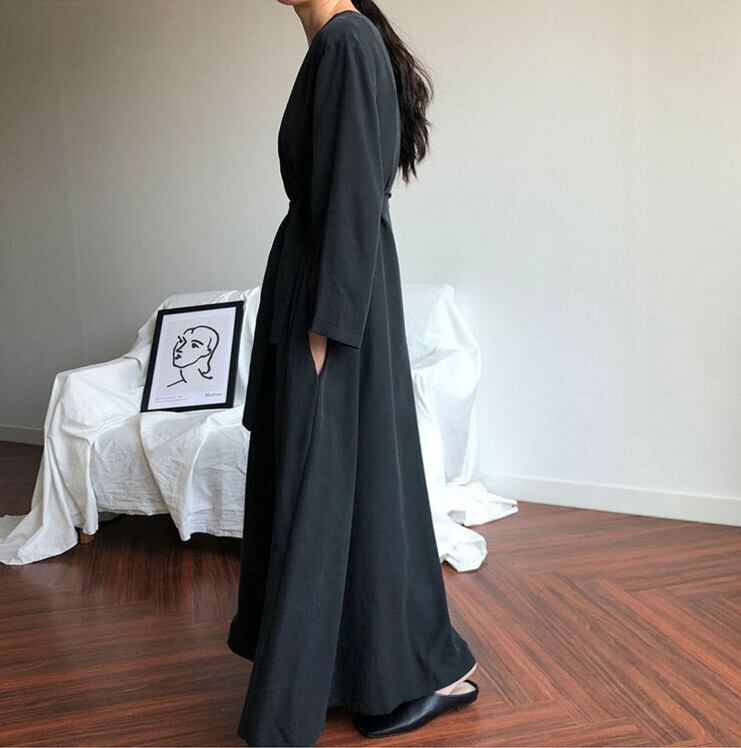 送料無料୨♥୧ スプリングオータムレディースマキシロングドレス Vネックブラックシャツ ヴィンテージ 春物 秋物 ビンテージ AOS49837751409