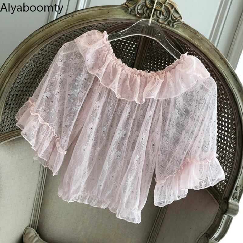 送料無料୨♥୧ スタイルサマーレディースシャツ カラーホワイトブラックメッシュブラウス フローラルレースクロップトップ トップス ピンク 大人ガーリー スウィート キュート カジュアル 夏物 花柄 AOS76748252077