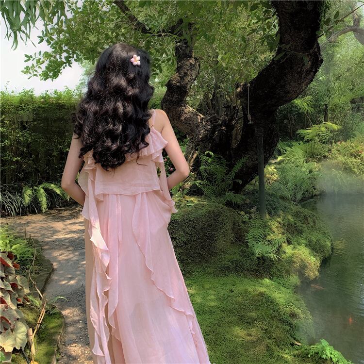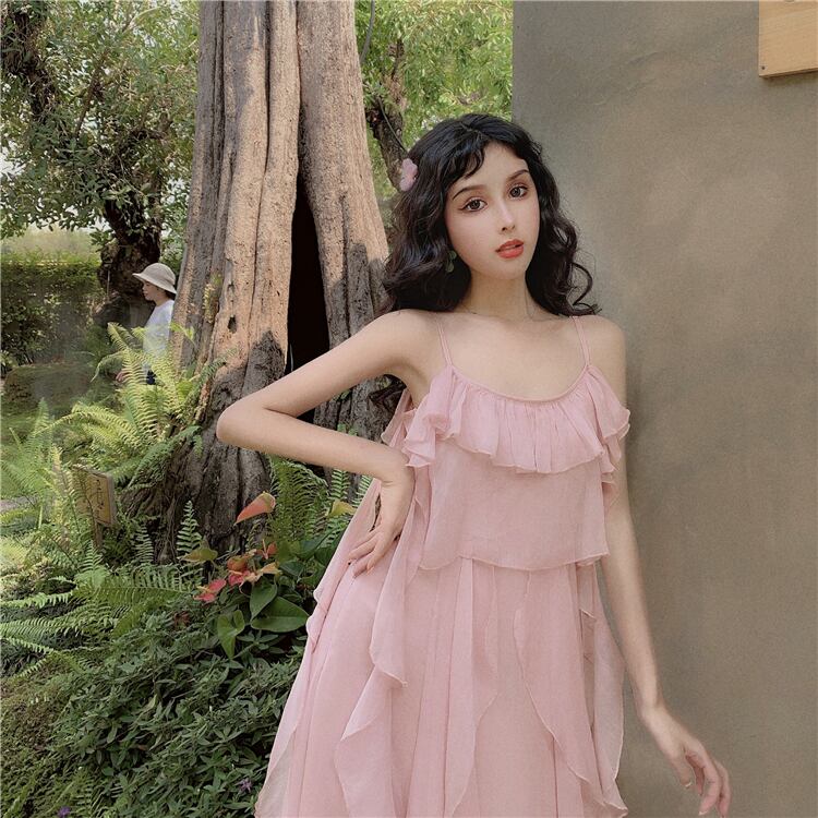 送料無料୨♥୧ サマーレディースマキシノースリーブドレス フリル ピンク レッド ラッフル 大人ガーリー スウィート キュート カジュアル 夏物 ビーチ AOS58032796308