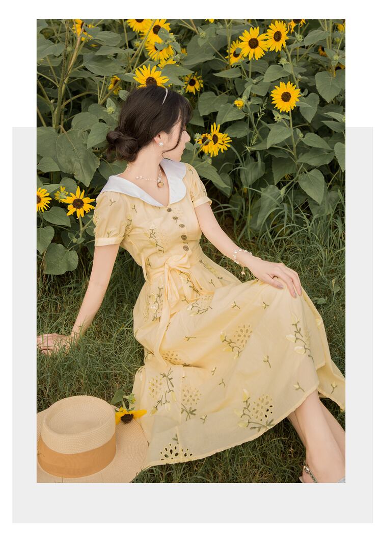 送料無料୨♥୧ サマーレディースミディドレス カラーイエローフローラル刺繍 大人ガーリー スウィート キュート カジュアル 夏物 花柄 AOS90256513436