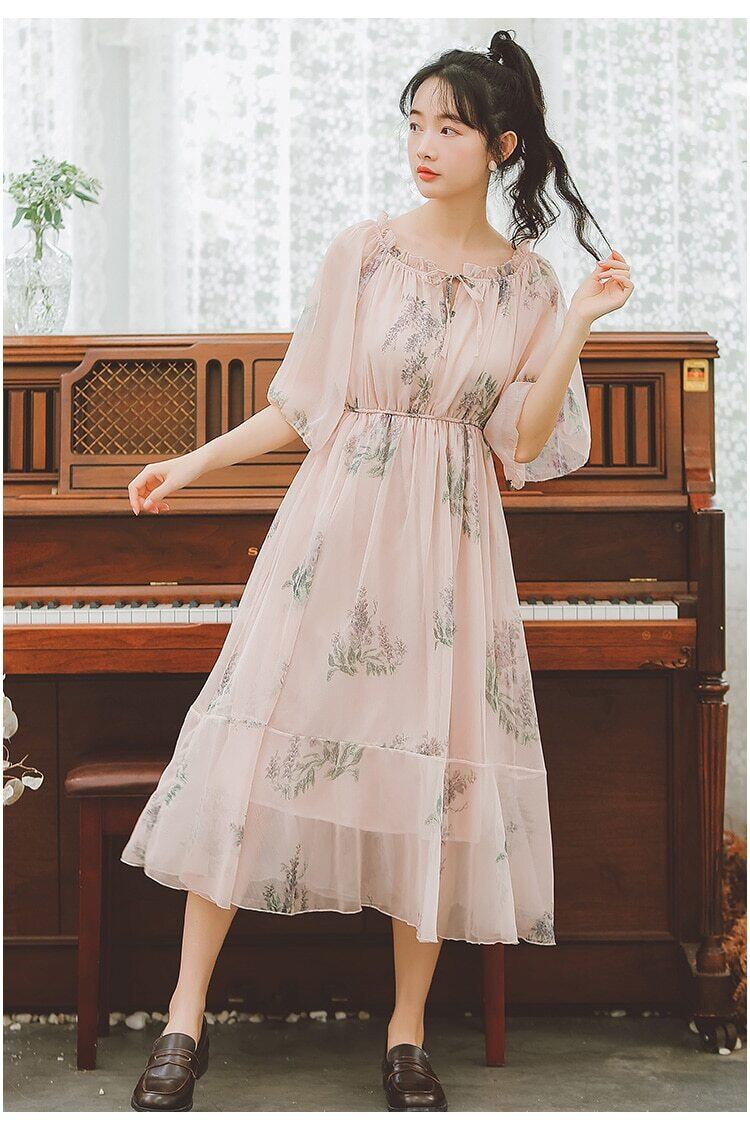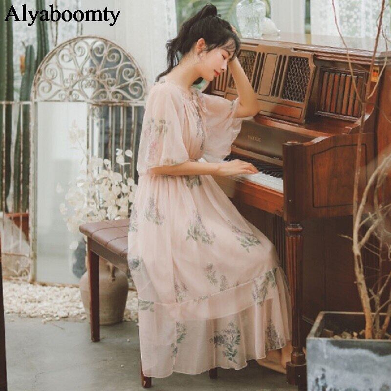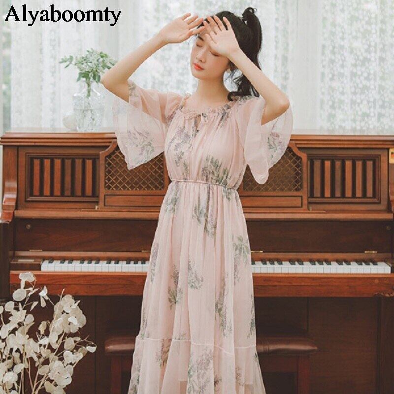 送料無料୨♥୧ サマースタイルレディースロングドレス フローラルプリントウェストフリルシフォンメッシュ ラッフル 夏物 花柄 AOS57353553052