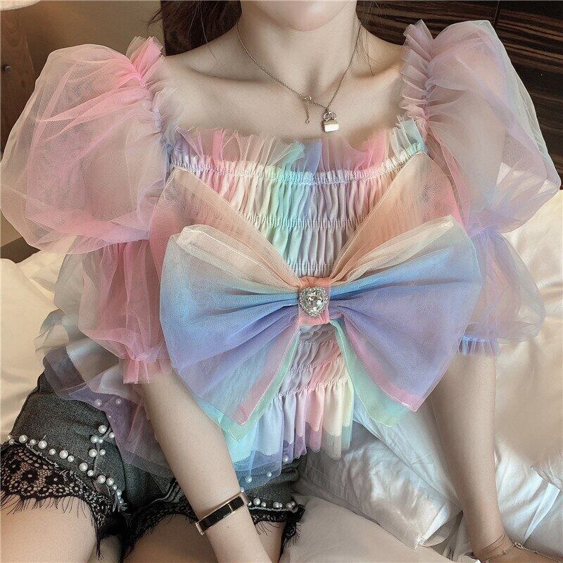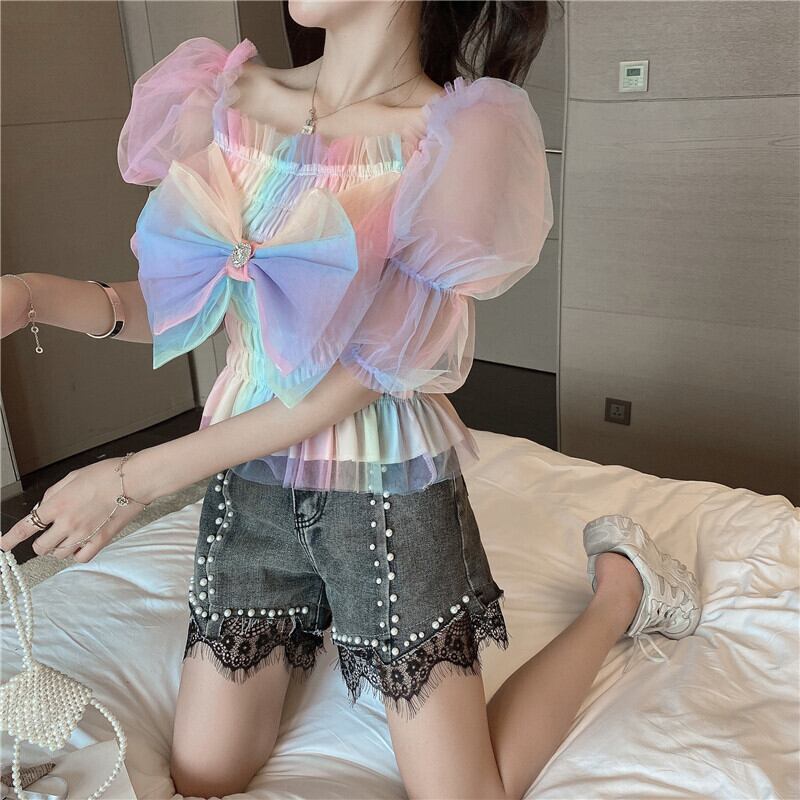 送料無料୨♥୧ サマーレディースセット カラーリボンメッシュスリーブレースショーツ かわいい 夏物 ブルマー スクウェア AOS99612903970