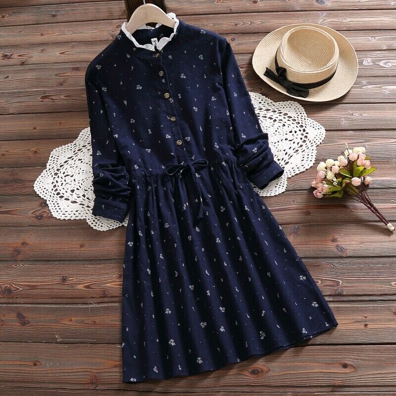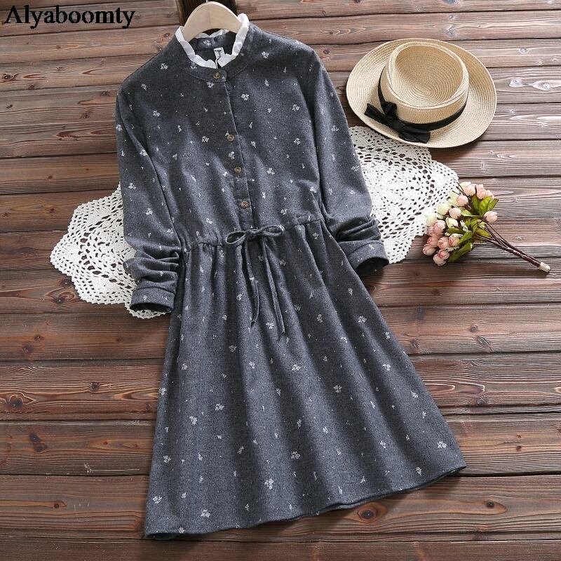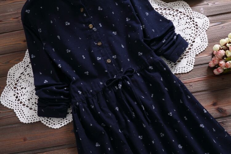 送料無料୨♥୧ スプリングオータムレディースドレス カラーフローラルプリント柄グレーネイビーブルー長袖スリーブ ロング 大人ガーリー スウィート キュート カジュアル 春物 秋物 花柄 AOS74839777521