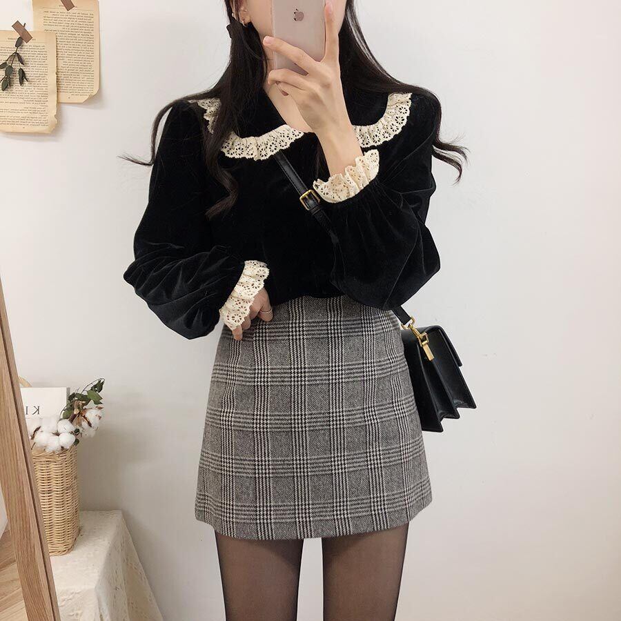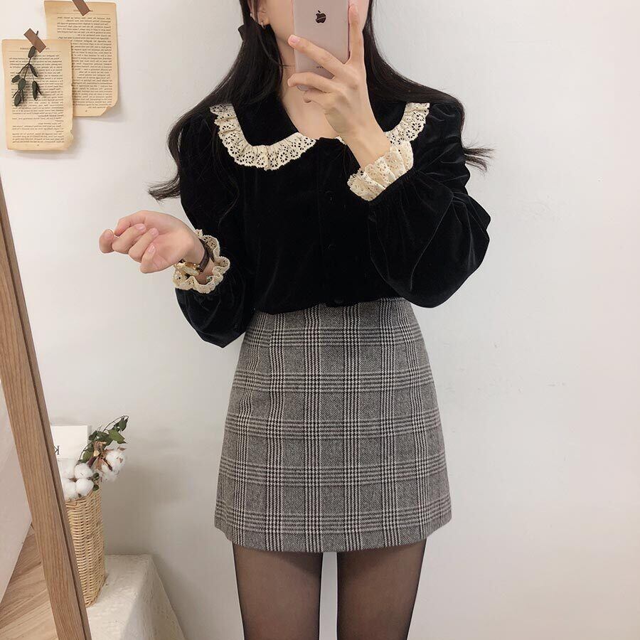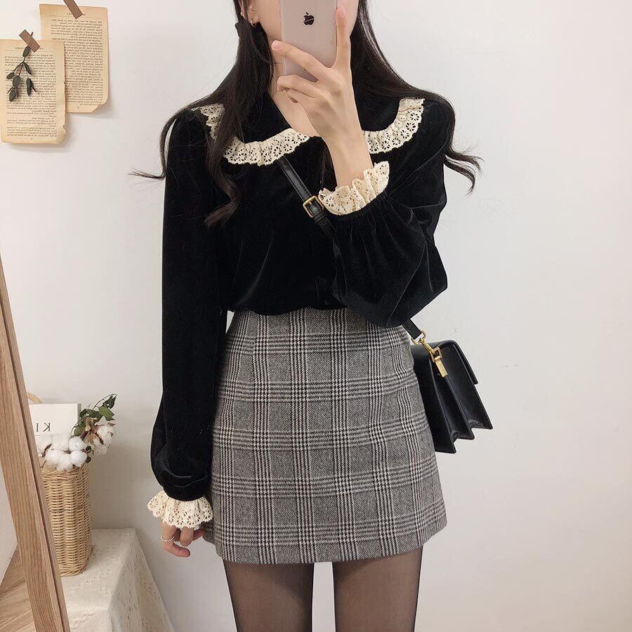 送料無料୨♥୧ スプリングオータムレディースシャツ カラーレースフリルブラックベルベットルーズブラウス スリーブ ラッフル 春物 秋物 AOS79828318350