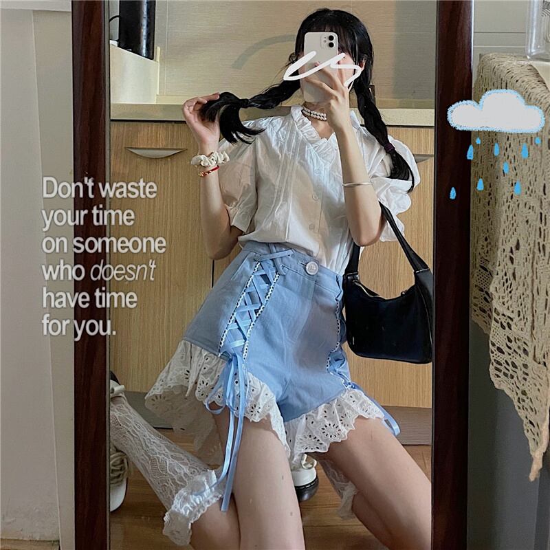 送料無料୨♥୧ サマーレディースセット ホワイトカラーバンドレースフリルショーツ ブルー ラッフル ブラウス 大人ガーリー スウィート キュート カジュアル かわいい 夏物 ブルマー AOS59829622989