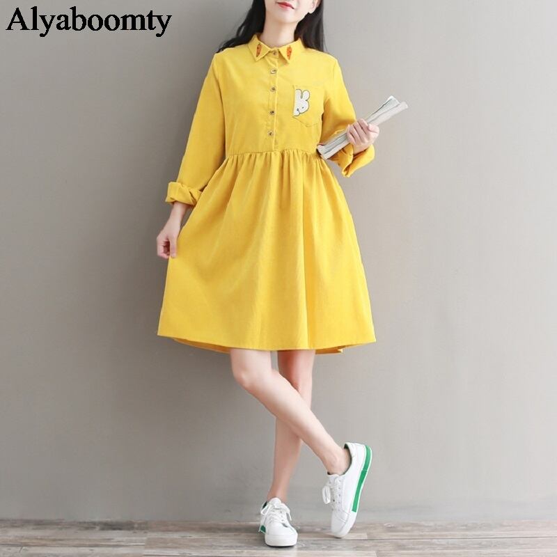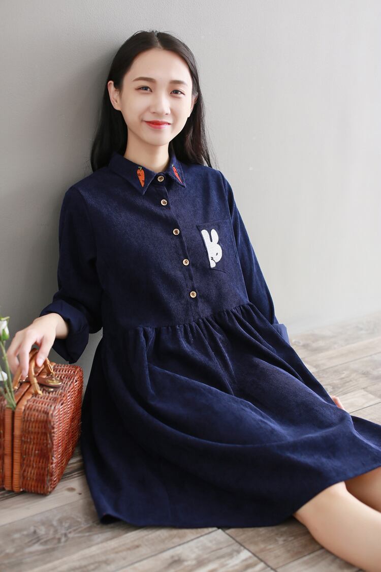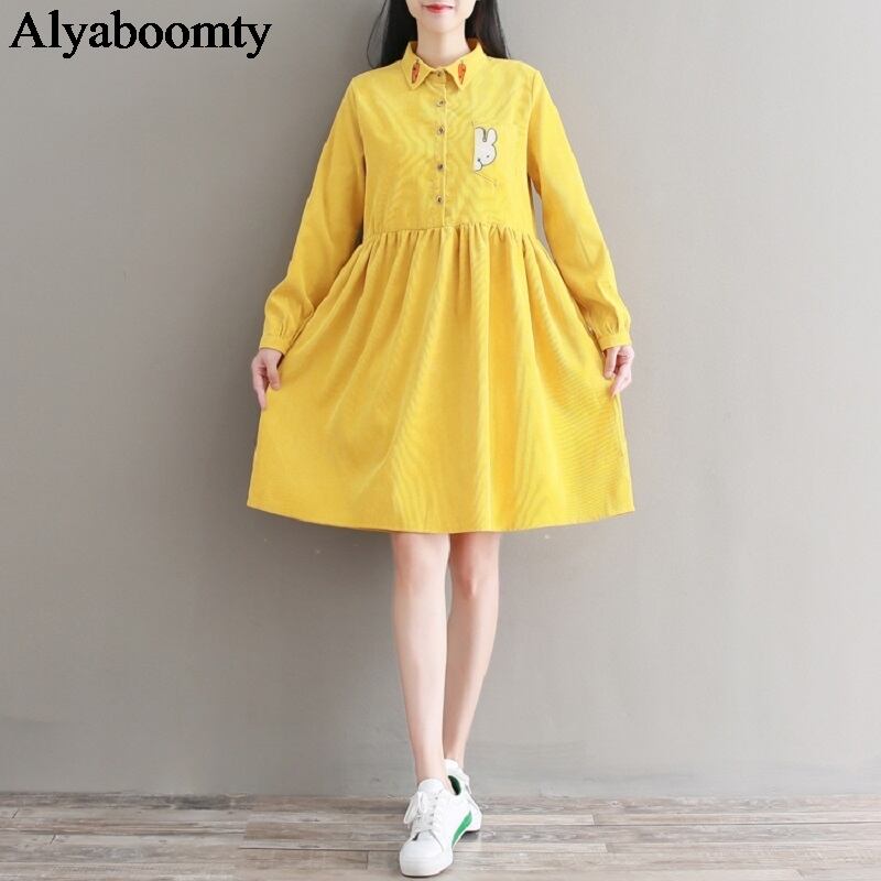 送料無料୨♥୧ オータムスプリングレディースルーズイエローネイビーブルー刺繍ドレス コーデュロイ 大人ガーリー スウィート キュート カジュアル 春物 秋物 AOS96375588332