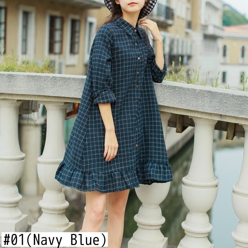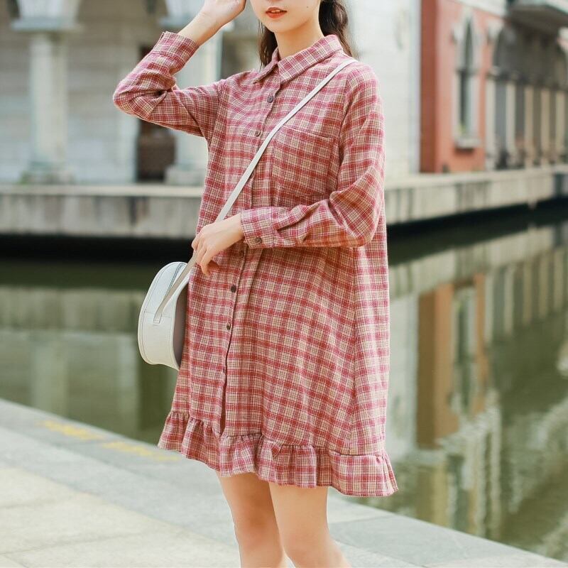 送料無料୨♥୧ スタイルスプリングレディースミニドレス カラー格子柄シャツ フリル コットン ラッフル 大人ガーリー スウィート キュート カジュアル 春物 AOS44807947948