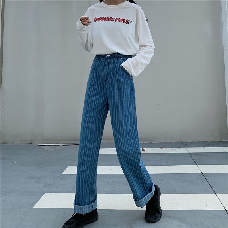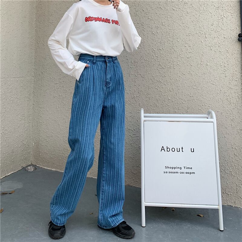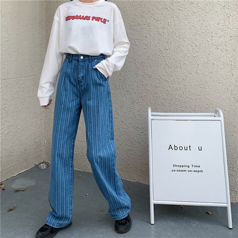 送料無料୨♥୧ スプリングオータムレディースルーズジーンズ ウェストストライプブルーストリートウェア コットン 春物 秋物 AOS85900348096