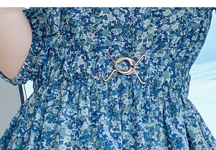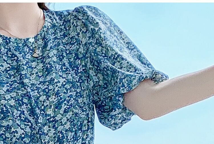 送料無料୨♥୧ サマーレディースドレス ブルーフローラルプリント半袖スリーブフリル ショート ハーフスリーブ ラッフル 夏物 花柄 Oネック AOS40797725460