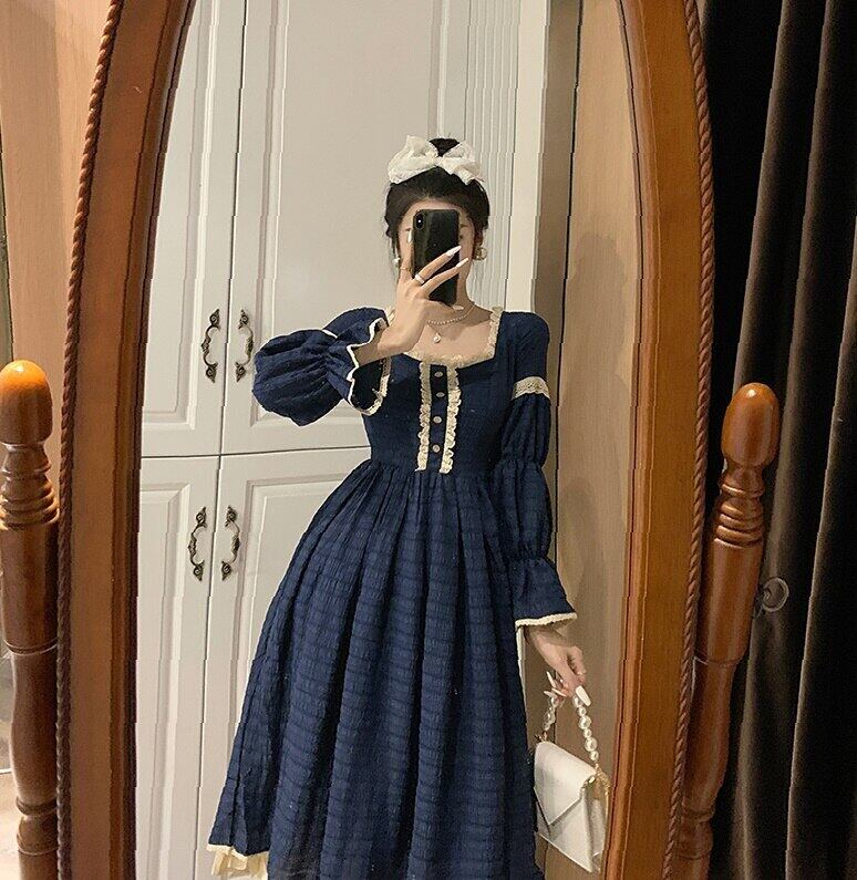 送料無料୨♥୧ スプリングオータムレディースヴィンテージドレス スタイルネイビーブルーパッチワークルーズミディ 大人ガーリー スウィート キュート カジュアル 春物 秋物 ビンテージ ヨーロピアン AOS26343568660
