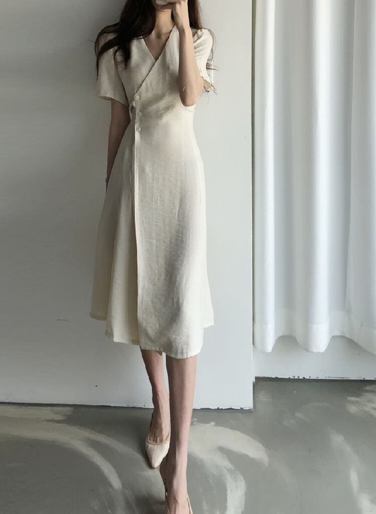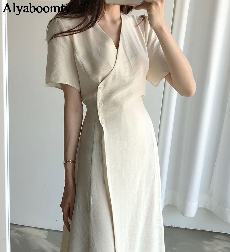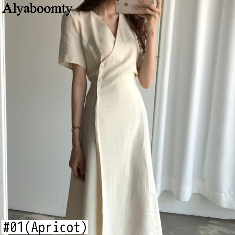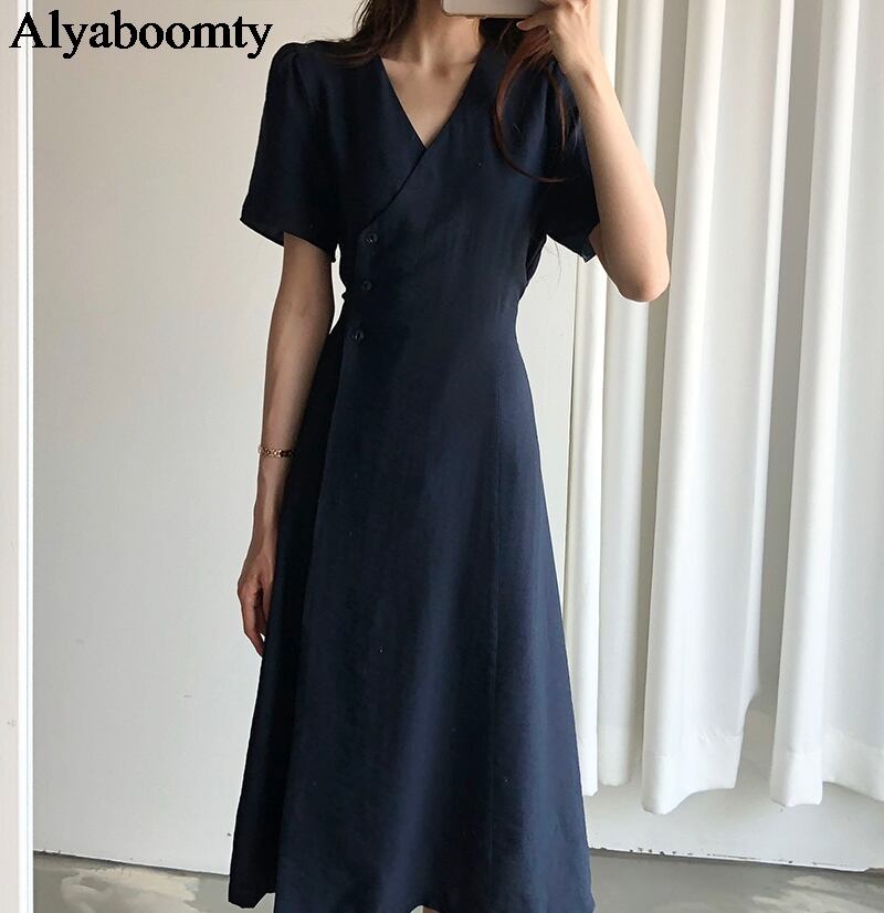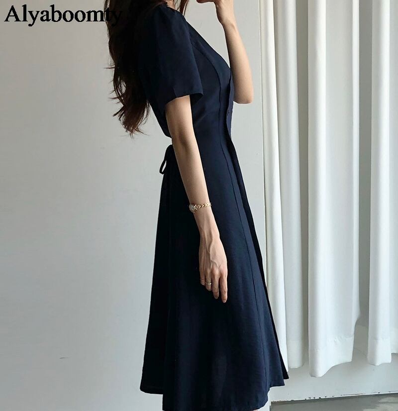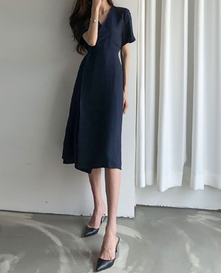 送料無料୨♥୧ スタイルサマーレディースソリッド ミディドレス Vネックネイビーブルードレス ワンピース 夏物 ソリッドカラー AOS91278472892