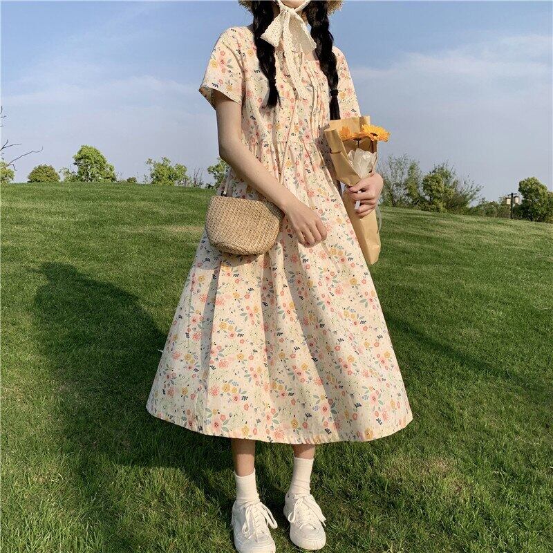 送料無料୨♥୧ サマーレディースロングドレス フローラルプリントルーズヴィンテージ半袖スリーブドレス ワンピース ショート ハーフスリーブ 大人ガーリー スウィート キュート カジュアル 夏物 花柄 ビンテージ AOS85030560806