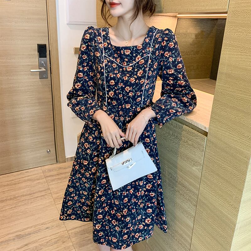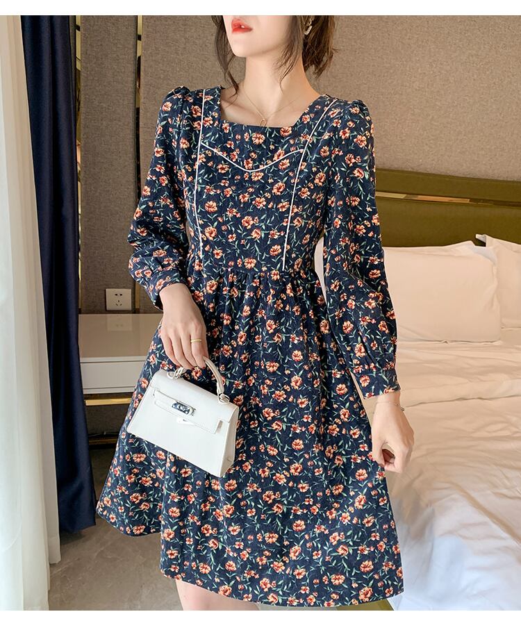 送料無料୨♥୧ スプリングオータムレディースドレス ネイビーブルーフローラルプリントヴィンテージコーデュロイ ロング 春物 秋物 花柄 ビンテージ AOS9525025731