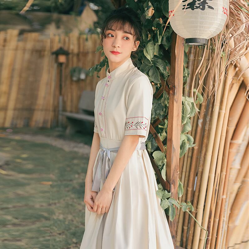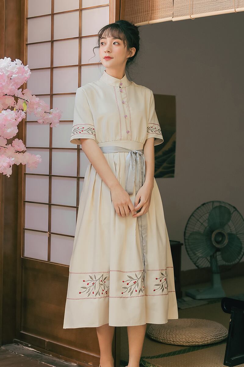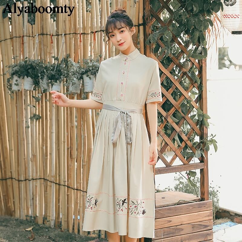 送料無料୨♥୧ レディースロングドレス スタンドカラーカラー刺繍ミディサマーヴィンテージ 夏物 フラワーデザイン ビンテージ AOS48179313419