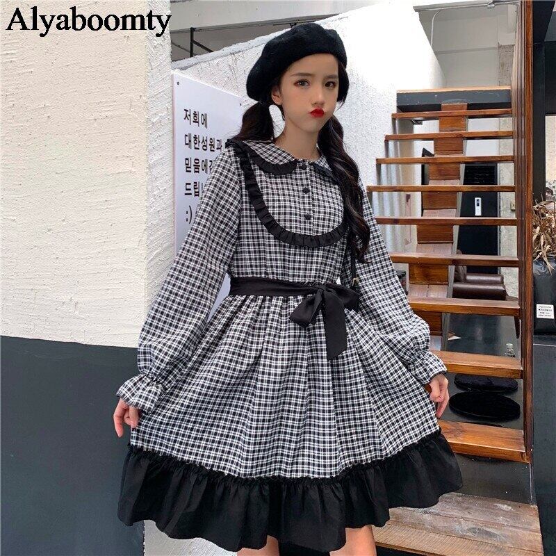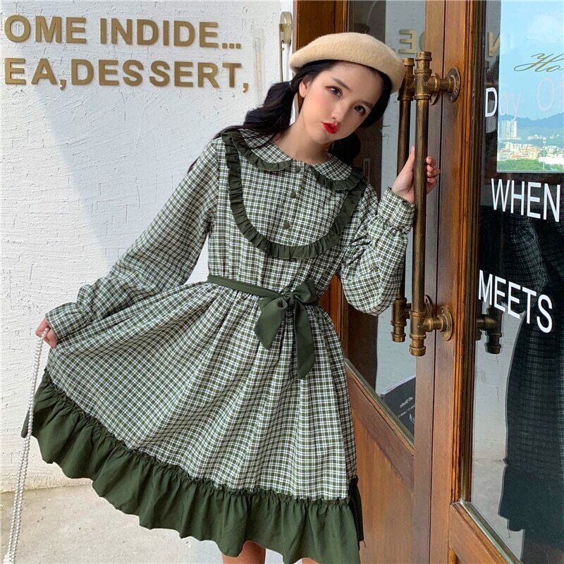 送料無料୨♥୧ スタイルオータムスプリングレディースドレス カラーグリーンブラック格子柄フリルリボン ラッフル 大人ガーリー スウィート キュート カジュアル 春物 秋物 AOS61869237847