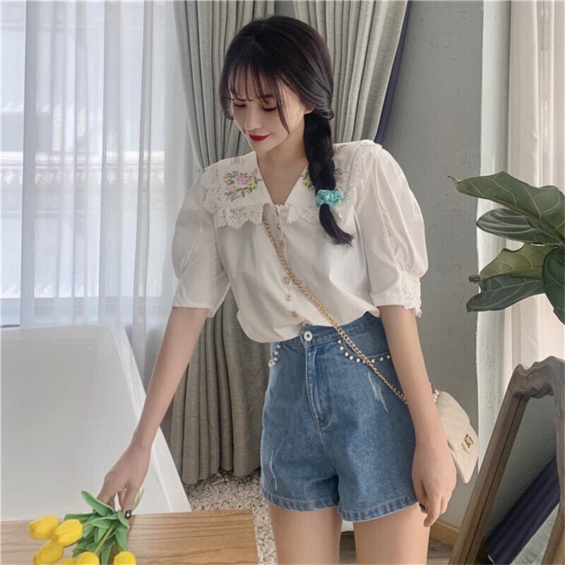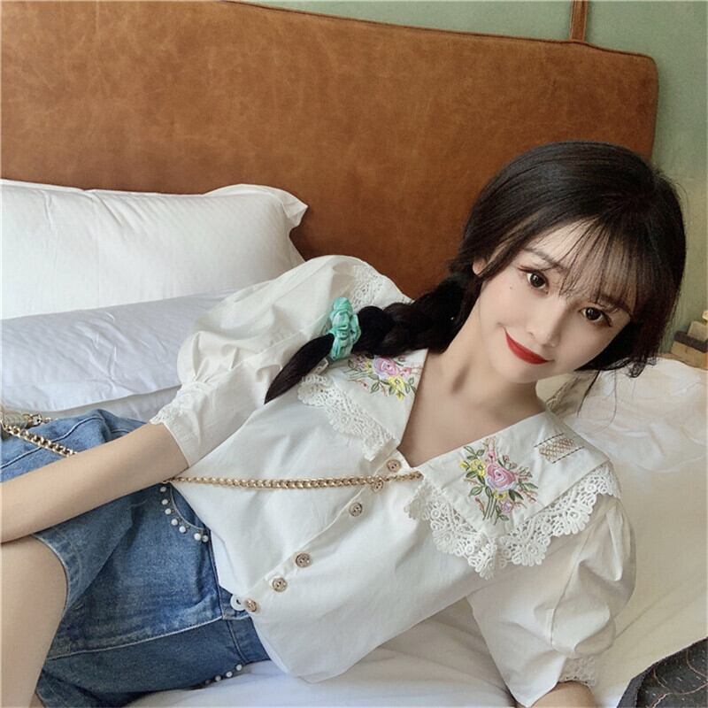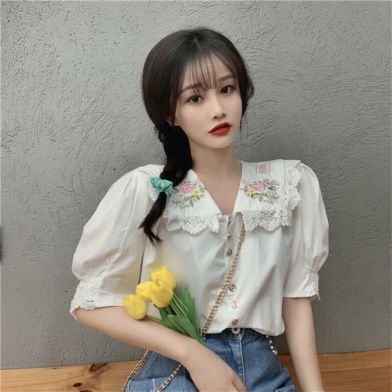 送料無料୨♥୧ スタイルサマーレディースブラウス カラーフローラル刺繍シャツ コットン 大人ガーリー スウィート キュート カジュアル 夏物 花柄 AOS21042898953