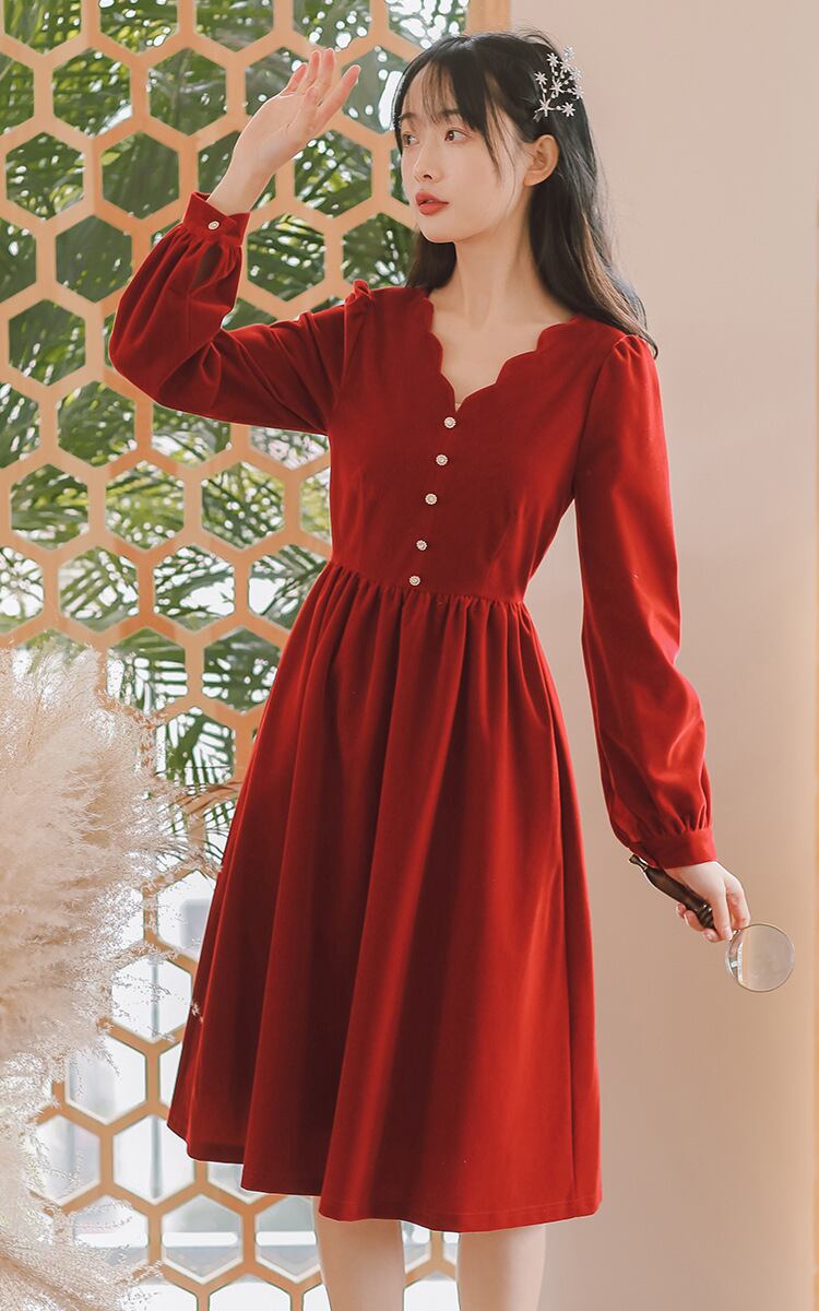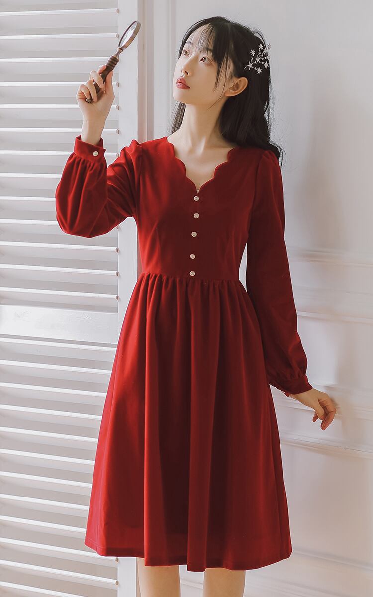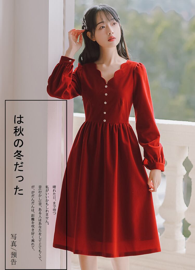 送料無料୨♥୧ スプリングレディーススタイルドレス VネックレッドブラックAライン長袖スリーブヴィンテージ ロング 春物 ビンテージ AOS25629742834
