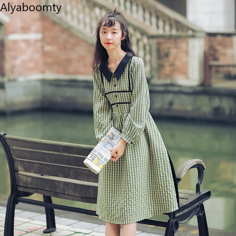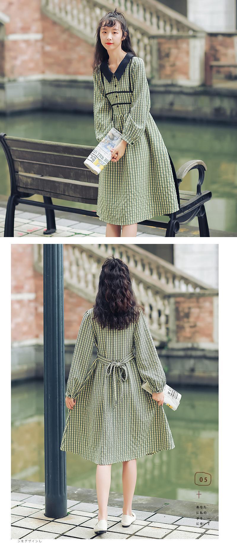 送料無料୨♥୧ スタイルレディースルーズドレス カラーグリーン格子柄バギー長袖スリーブドレス ワンピース ロング AOS66544590120