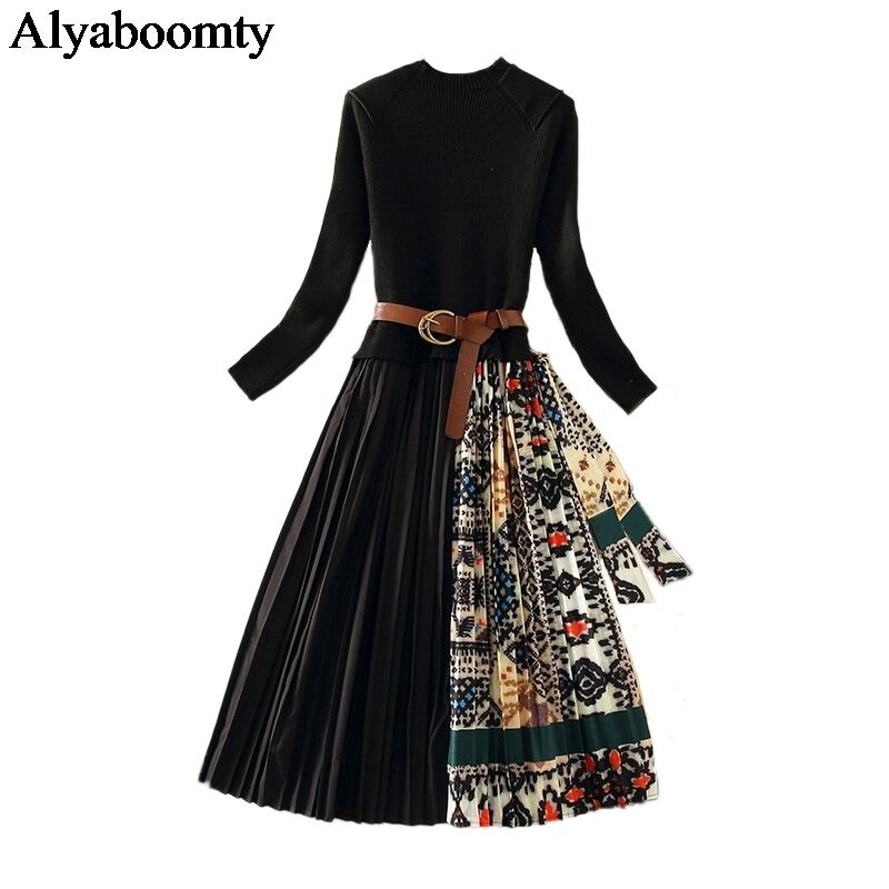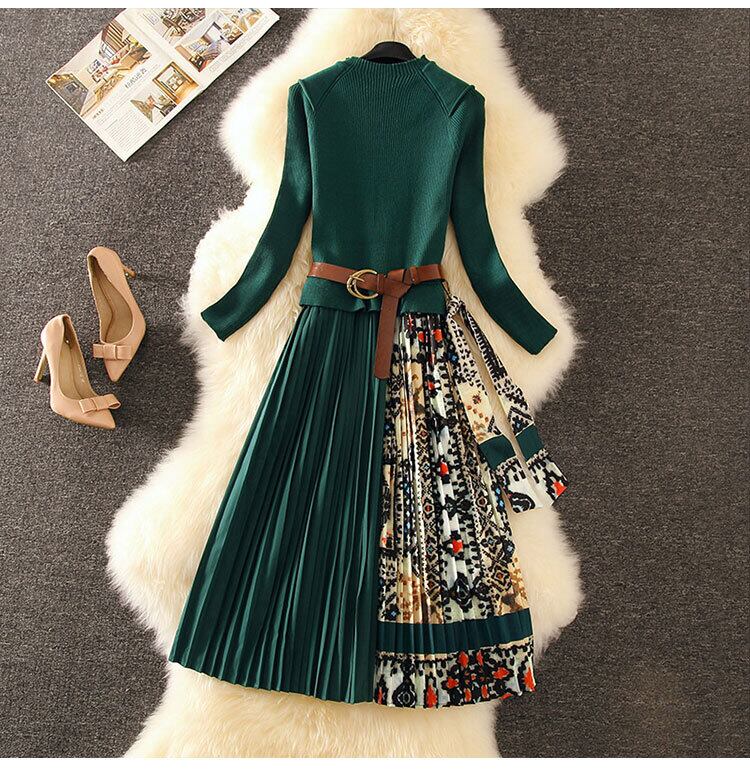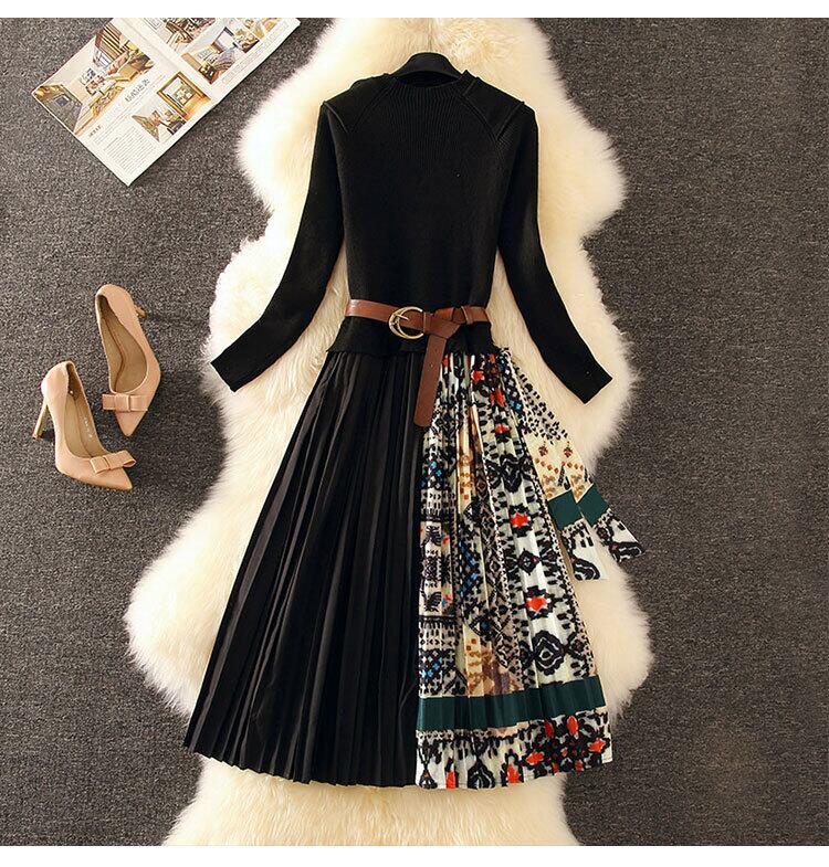 送料無料୨♥୧ ウィンターレディースセーター ドレス ブラックネイビーグリーンパッチワークボヘミアンプリーツミディニット 冬物 AOS49580020869