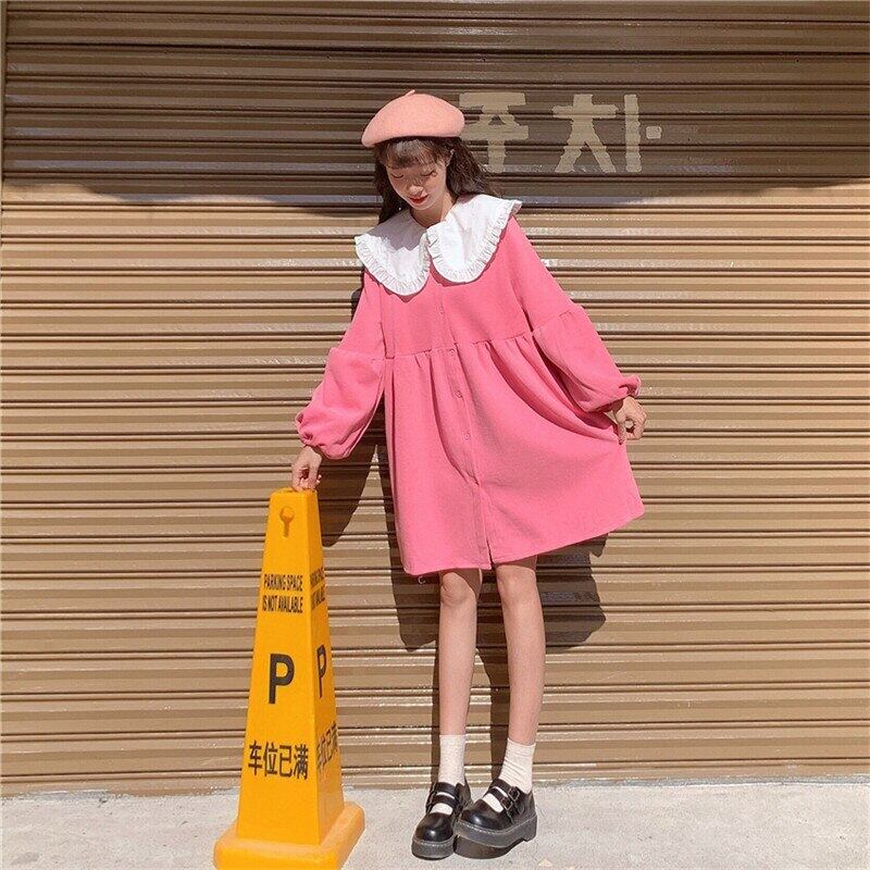 送料無料୨♥୧ eseプレッピースタイルレディースミニドレス ピーターパンカラーピンクイエロー特大シャツ 可愛いランタンスリーブドレス ワンピース AOS66195700044
