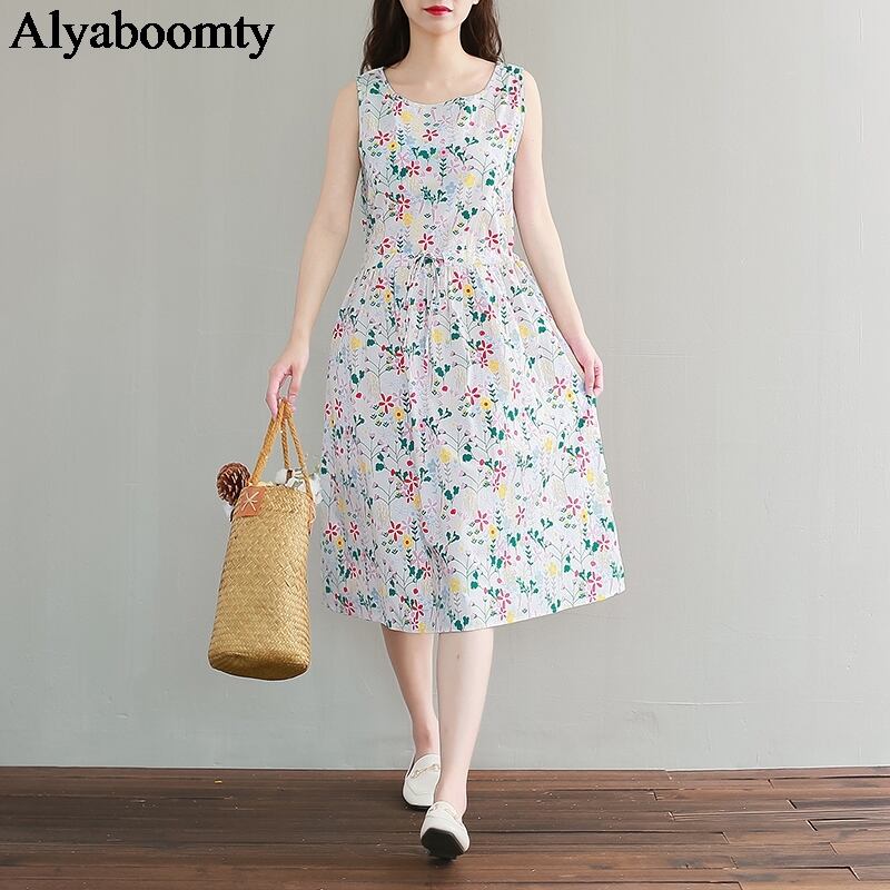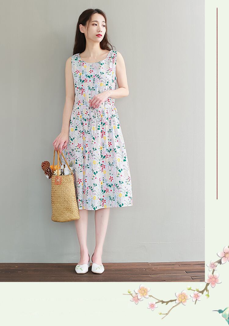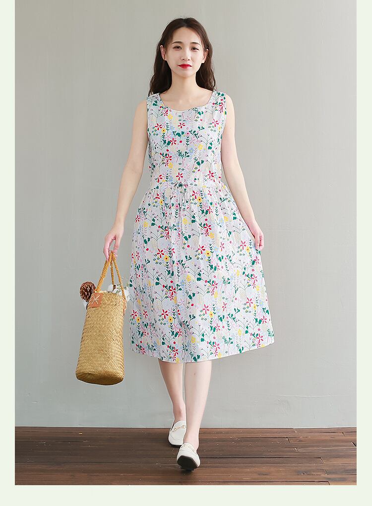 送料無料୨♥୧ サマーレディースドレス フローラルプリントノースリーブドレス ワンピース コットン 大人ガーリー スウィート キュート カジュアル 夏物 ビーチ 花柄 Oネック AOS15370433284
