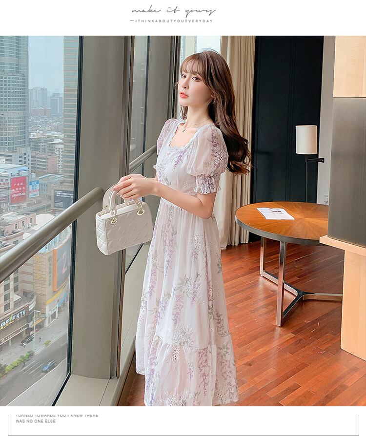 送料無料୨♥୧ サマーレディースロングヴィンテージドレス カラー刺繍シフォンフローラルミディ 夏物 花柄 スクウェア ビンテージ AOS20188108800