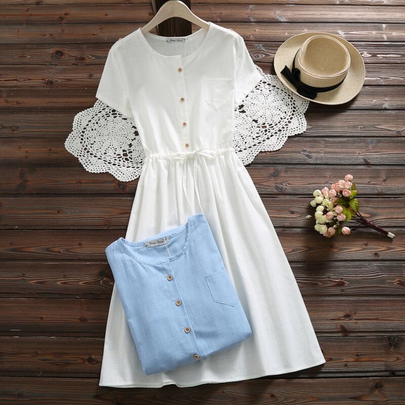 送料無料୨♥୧ サマーソリッド レディースドレス 半袖スリーブホワイトブルー ショート コットン ハーフスリーブ 大人ガーリー スウィート キュート カジュアル 夏物 Oネック ソリッドカラー AOS52754786999