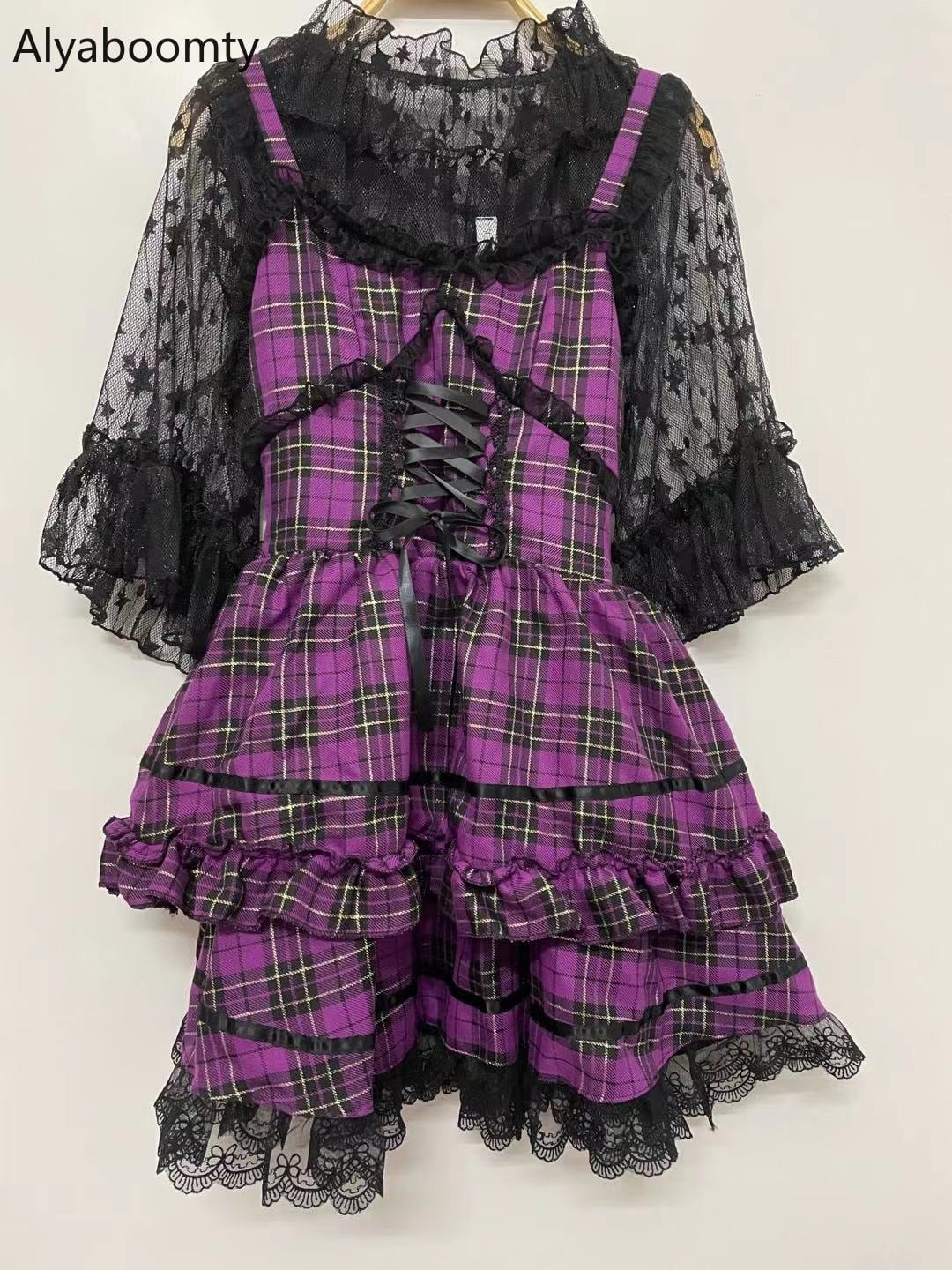 送料無料୨♥୧ サマーレディースガウンドレス スタイルレッド格子柄レースフリル ラッフル かわいい 夏物 パープル AOS80099935163
