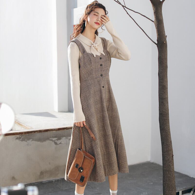 送料無料୨♥୧ スタイルオータムウィンターレディースヴィンテージドレス 格子柄ノースリーブ 大人ガーリー スウィート キュート カジュアル 秋物 冬物 ビンテージ ヨーロピアン AOS4695038130