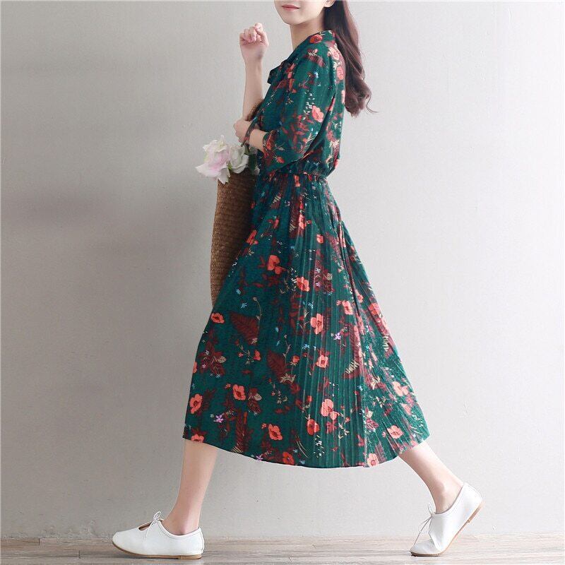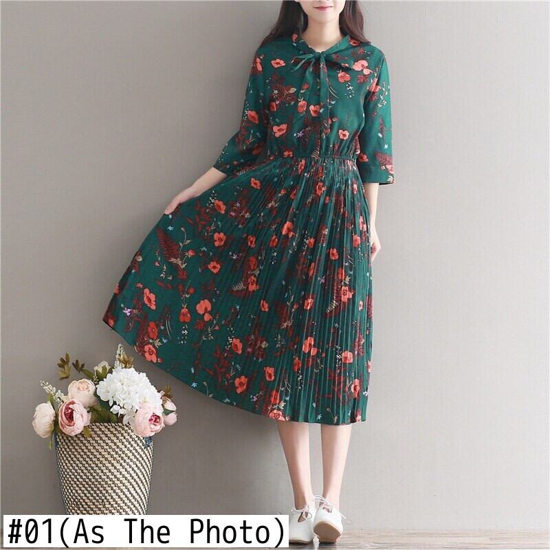 送料無料୨♥୧ オータムスプリングレディースロングドレス フローラルプリント柄四部袖スリーブルーズヴィンテージプリーツドレス ワンピース 大人ガーリー スウィート キュート カジュアル 春物 秋物 花柄 ビンテージ AOS2324518909