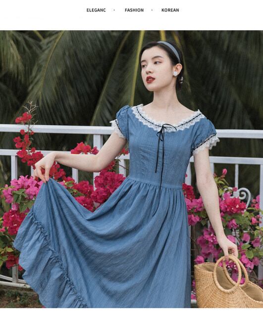 送料無料୨♥୧ サマーレディースソリッド ロングドレス レースウェストヴィンテージスタンダードスリーブフリル ブルー レトロ ラッフル 夏物 Oネック ソリッドカラー ビンテージ AOS79746944790