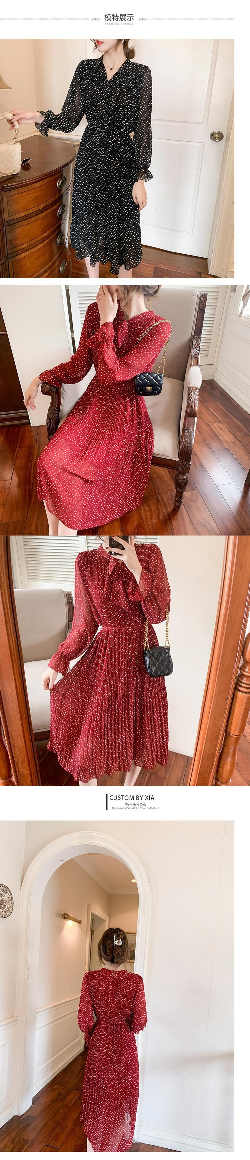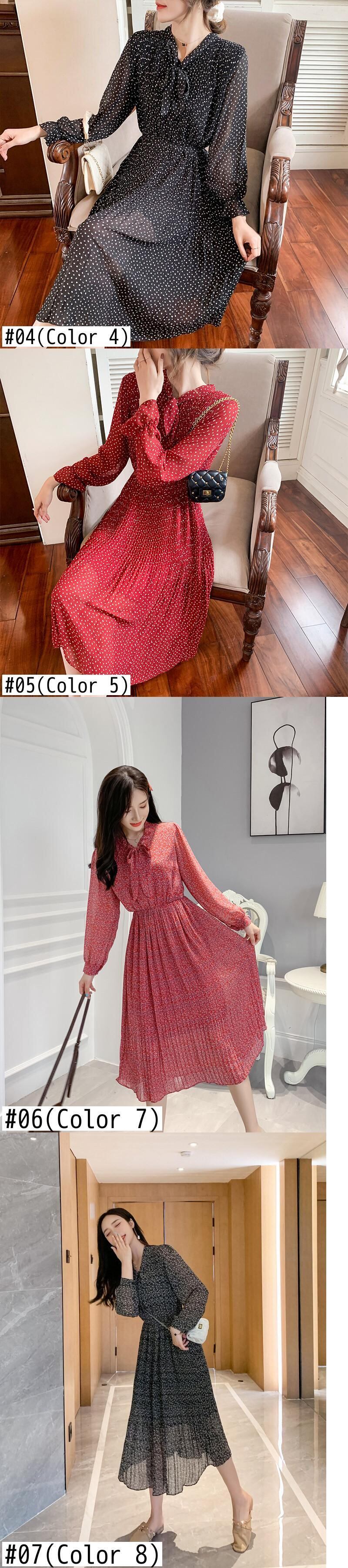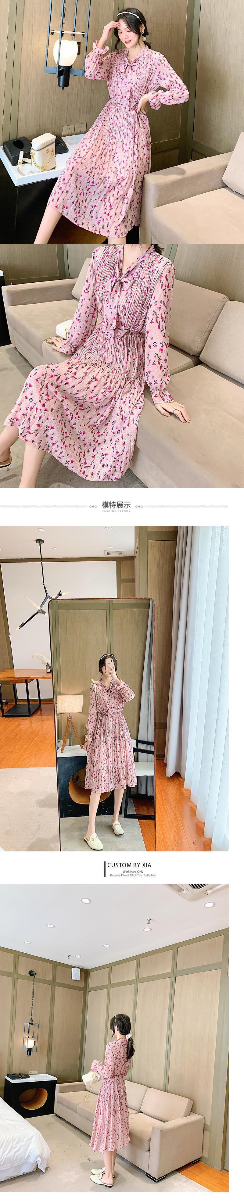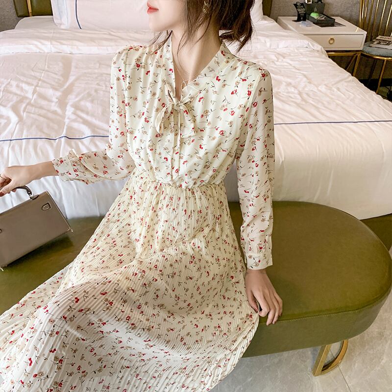 送料無料୨♥୧ スプリングオータムレディースドレス リボンカラープリントシフォンフローラルミディプリーツ 春物 秋物 花柄 AOS54599718898