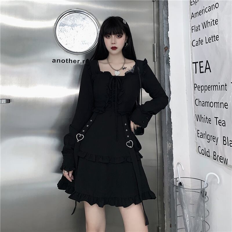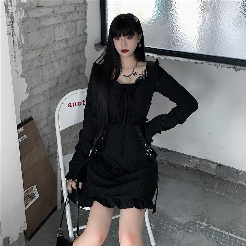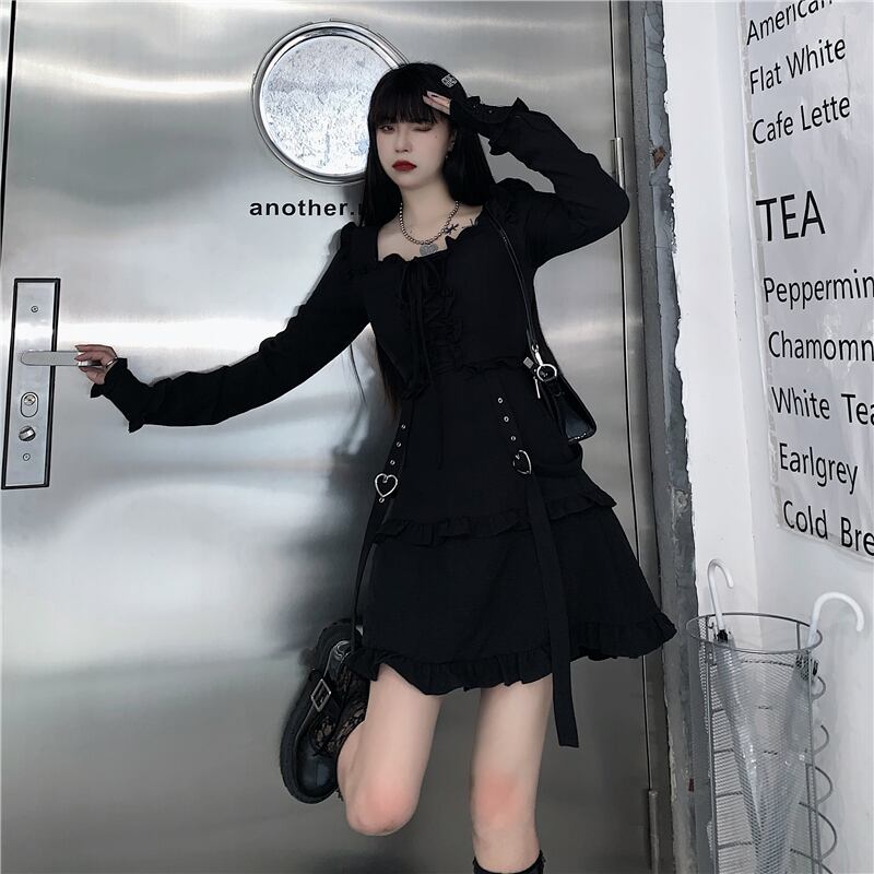 送料無料୨♥୧ レディースブラックミニドレス スタイルストリートウェアバンドハートフリル ラッフル かわいい AOS48959905097