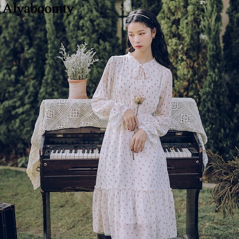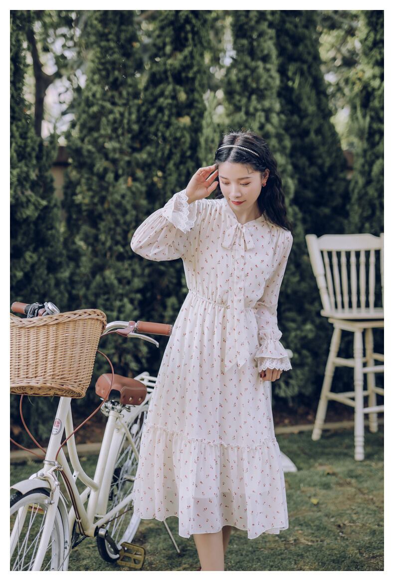 送料無料୨♥୧ オータムスプリングレディースロングドレス リボンカラーシフォンフローラルプリント 春物 秋物 花柄 フラワーデザイン AOS79140373183