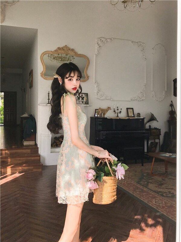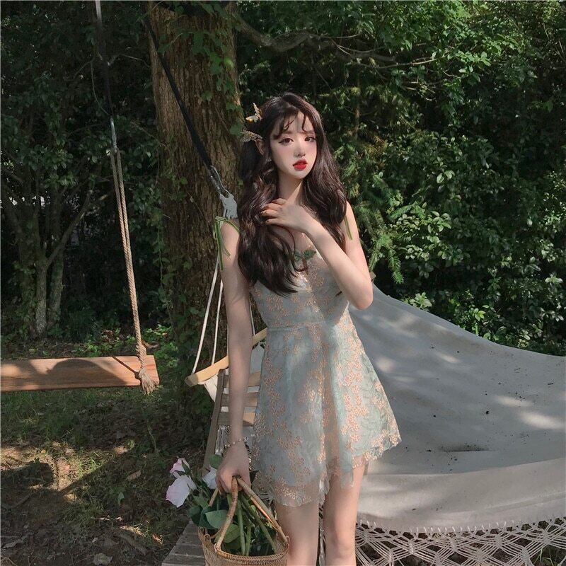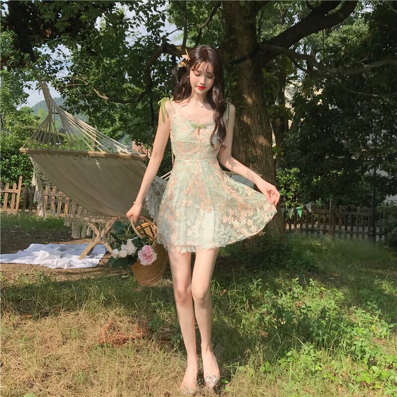 送料無料୨♥୧ サマーレディースミニドレス グリーンフローラル刺繍 大人ガーリー スウィート キュート カジュアル エレガント 夏物 花柄 AOS50959484823