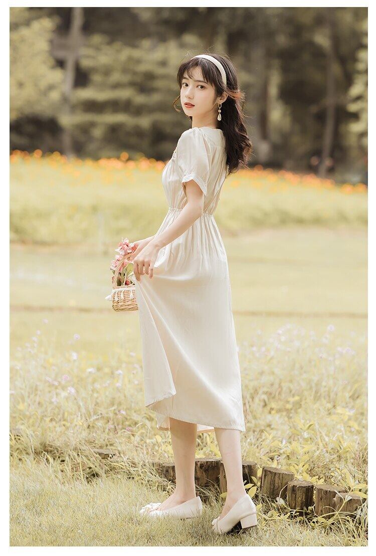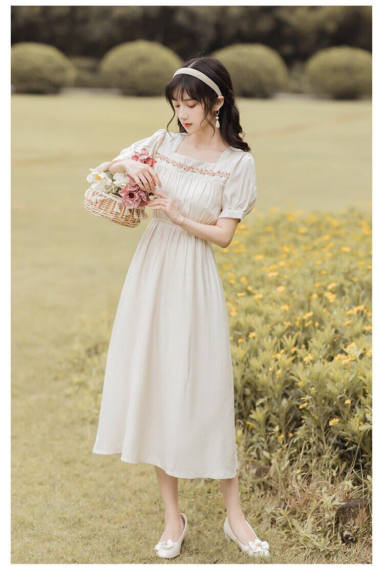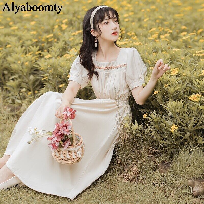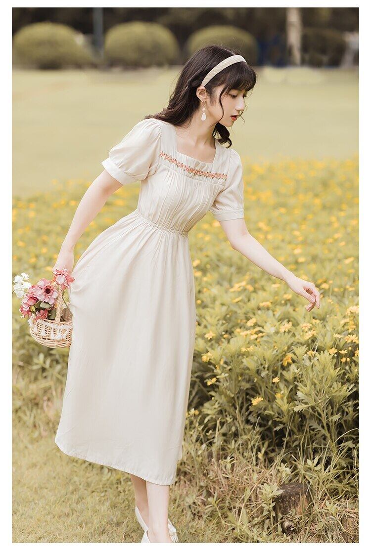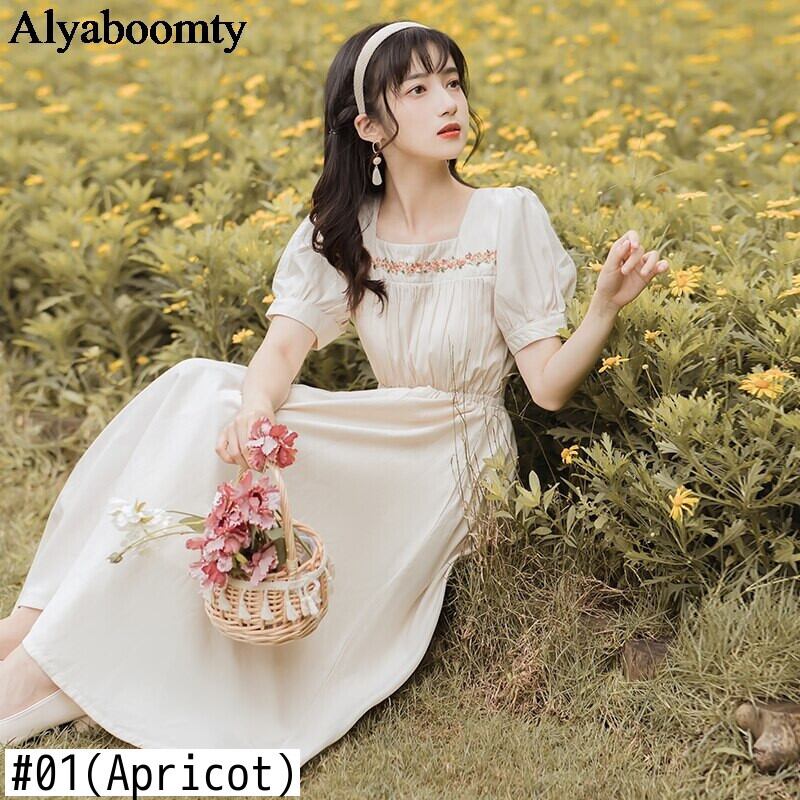 送料無料୨♥୧ サマーレディースロングドレス カラーフローラル刺繍ウェストスリーブ 大人ガーリー スウィート キュート カジュアル 夏物 花柄 スクウェア AOS74517622624