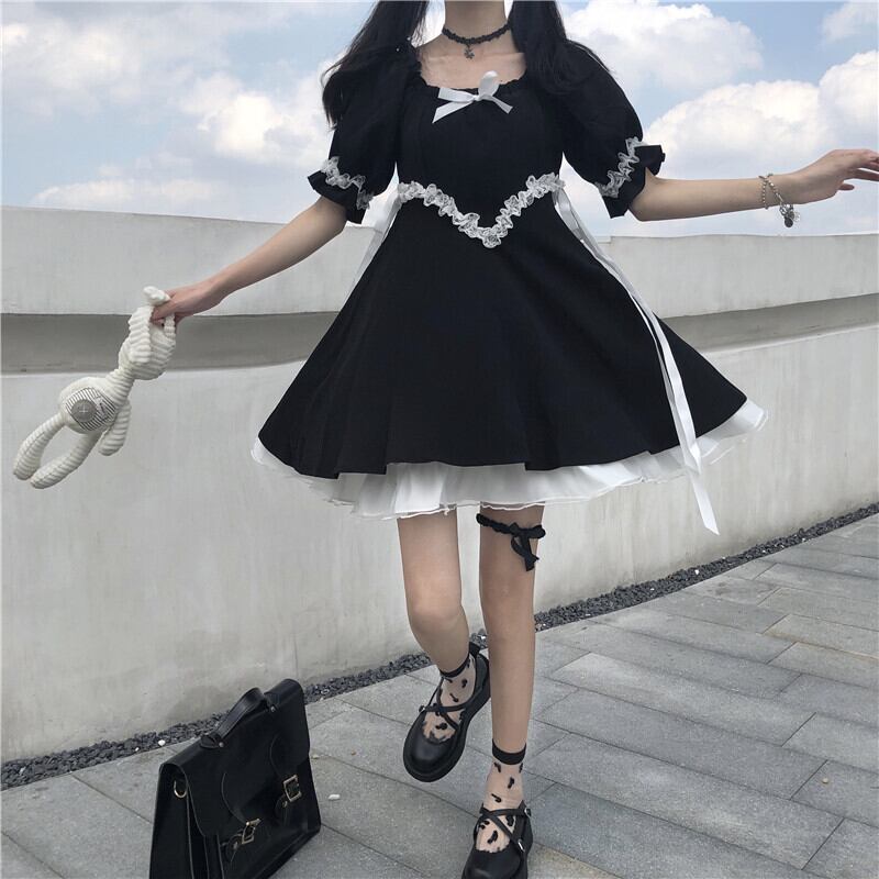 送料無料୨♥୧ サマーレディースブラックミニドレス ストリートウェアリボンレースバンドスリーブフリル ラッフル 大人ガーリー スウィート キュート カジュアル かわいい 夏物 AOS23284628640