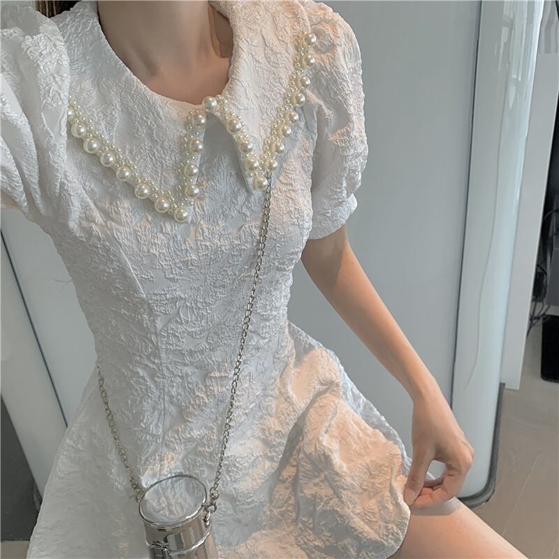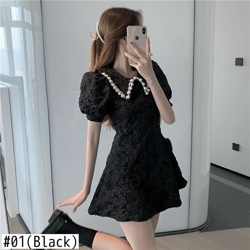 送料無料୨♥୧ サマーレディースミニドレス カラーホワイトブラックスリーブジャカード 夏物 パール 真珠 AOS65736169266